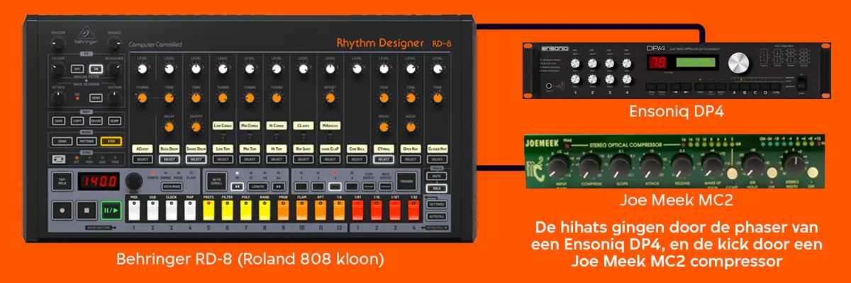 We beginnen bij de drums. Ok, dit kan ik. Op de drumcomputer voer je een patroon in van 16 noten, die als knipperende lichtjes voor je langs schieten. Om het mezelf gemakkelijk te maken stel ik het tempo in op 95 bpm. Dat is een praktische keuze - lekker veel tijd om na te denken - maar direct ook een esthetische. 95 is super traag voor house, maar ik ben een sucker voor muziek met dat tempo. Het is bedwelmend, trippy, als een dj vroeg op de avond met dit tempo begint wil ik er het liefst de hele nacht in blijven hangen. Ik wil zo’n track maken waar je op moet dansen alsof je spaghetti bent. De kickdrum is simpel, die loopt gewoon door. Althans, dat heb ik bij deze besloten. Er zit standaard al iets van effect overheen, niks meer aan doen. Met de rest creëren we een signature sound. Snares natuurlijk, toms, en al snel komen we bij het eerste echt onderscheidende patroontje voor de track: de hi-hats. Ik druk letterlijk razendsnel lichtjes aan en uit terwijl de track doorloopt, en ineens ontstaat er wat met de open en gesloten hats. Vooral als je op het apparaat links van de drumcomputer ook nog een phaser over de hi-hats zet, zodat ze als het ware rond gaan zingen.