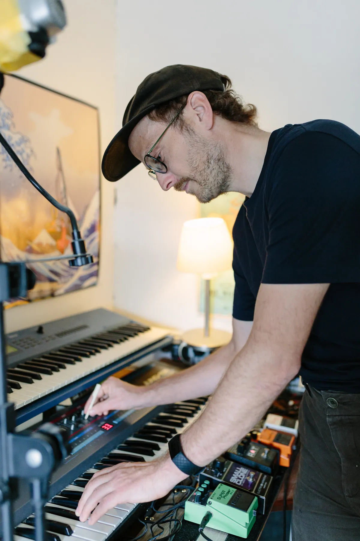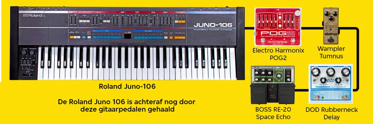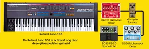 Nou ja, dat is natuurlijk nog maar het begin. Want links staart me nog een heel bord vol gitaarpedalen aan. Space echo, tig soorten delay, een Electro-Harmonix octave generator. Het zijn allemaal effecten die al decennia lang gebruikt worden om geluid te manipuleren, en ik heb geen idee wat ik doe, maar ik ga het spoor dat we zojuist opgenomen hebben nog een keer te lijf met deze pedalen. Meer delay creëert afstand en spanning, een octaaf toevoegen creëert meer intensiteit, en dat kan ik dus goed gebruiken in de grote break.