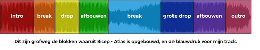 Een beetje dance-track heeft natuurlijk een vast format, een blauwdruk die eigenlijk altijd werkt. Leg een willekeurige Bicep-track op de snijtafel, en je hoort hoe dat gaat: eerst een intro, waarin de basis al aanwezig is, maar nog terughoudend. Niet alles is er, en vooral: niet voluit. In de eerste minuut van de track wordt de textuur steeds rijker en bloeit de track als het ware op. Toch gaat het gas er al snel weer af, met een kleine break - kickdrum weg, waarna de track zijn volle kleurenpalet mag laten zien in een eerste drop. Dan, op ongeveer de helft, zit vaak de ‘lange break’. Wederom haal je de kick weg, creëer je ruimte in het geluid, om vervolgens langzaam maar zeker intensiteit op te bouwen richting een tweede drop, die het onmiskenbare hoogtepunt van de track is. Hier hoor je alle signature sounds van de track, plus een paar special features die je nog niet uit de hoge hoed getoverd had. Het Bicep-format, dat gaan we toepassen op mijn track, als ware het gekleurde blokken. De blokken zijn heilig, de invulling kan nog alle kanten op.