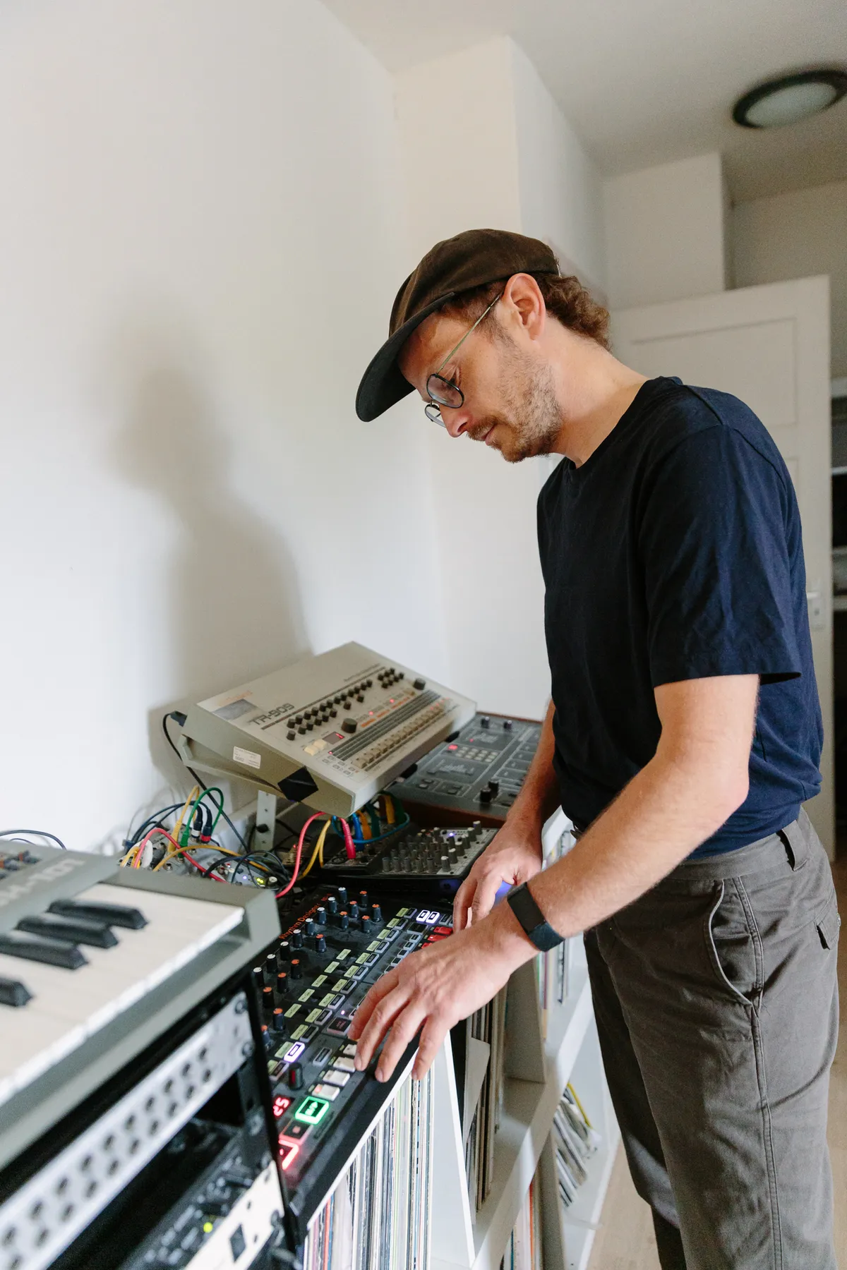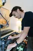 In de gearmaand doken we al in de geschiedenis van technische snufjes, baanbrekende instrumenten en vondsten die de muziek verder stuwden. Ik ben thuis bij Max Bedeker, 3voor12 collega, dj en producer onder de naam Riptide. En - niet onbelangrijk - Max is de maker van de tune van De Machine, waarvoor wij altijd veel complimenten krijgen. In zijn studio is een aantal van die hoekstenen uit de popgeschiedenis terug te vinden. Het universum van Max kent zo zijn vaste ijkpunten. Hij zweert bij Muse, hij vindt Daft Punk de ultieme house-act, zou een moord doen voor een job als assistent in de Soulwax studio. En bij kennismaking met zijn eigen studio in Hilversum blijken de signature instrumenten van zijn helden ook bij hem present te zijn. Goed, wat gaan we doen? Er staat hier een hele stapel drumcomputers, basmachines, synths. Alles in connectie met Ableton Live, waar natuurlijk ook de wereld aan plugins in zit. Links op de grond ook nog gitaarpedalen. Meer dan genoeg materiaal dus.