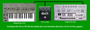 Dan twee andere klassiekers die zich in elke housetrack thuis voelen: de 101 en de 303, twee bass synths die op elkaar lijken, maar die toch een iets andere klank meebrengen. Zonder de 303 geen acid, en dat kenmerkende geluid wil ik ook in mijn track gebruiken. We gaan op alle twee deze apparaten super simpele patroontjes laten lopen, en die gaan we met elkaar vervlechten. Ook hier zijn het de frequency en resonance die al het werk doen. Houd je die twee helemaal naar beneden, dan hoor je je apparaat amper. Schuif je ze helemaal open, dan ontstaat die kenmerkende hoge fluit die je tot waanzin kan drijven. Goed doseren dus. Ik doe eerst de 303, die zich een beetje bescheiden op moet stellen. Je mag hem horen, hij mag wat toevoegen, maar ik wil niet dat hypernerveuze, het 'Higher State Of Consciousness' effect. De 101 komt er pas iets later in, en die mag vervolgens prominenter worden. Zijn piekmomenten: aan het begin van de grote break, en aan het eind van die break, net na de drop. Daar moet de 101 echt schwung geven aan het geluid. Rechts op de 101 zitten trouwens ook nog een paar schuifjes, met daarbij de letters A, D, S en R, attack, decay, sustain en release. Als ik die allemaal een stukje omhoog schuif aan het eind van de track, maakt de 101 ineens een soort kloppend geluid. Alsof dat soepele baslijntje ineens percussie wordt.