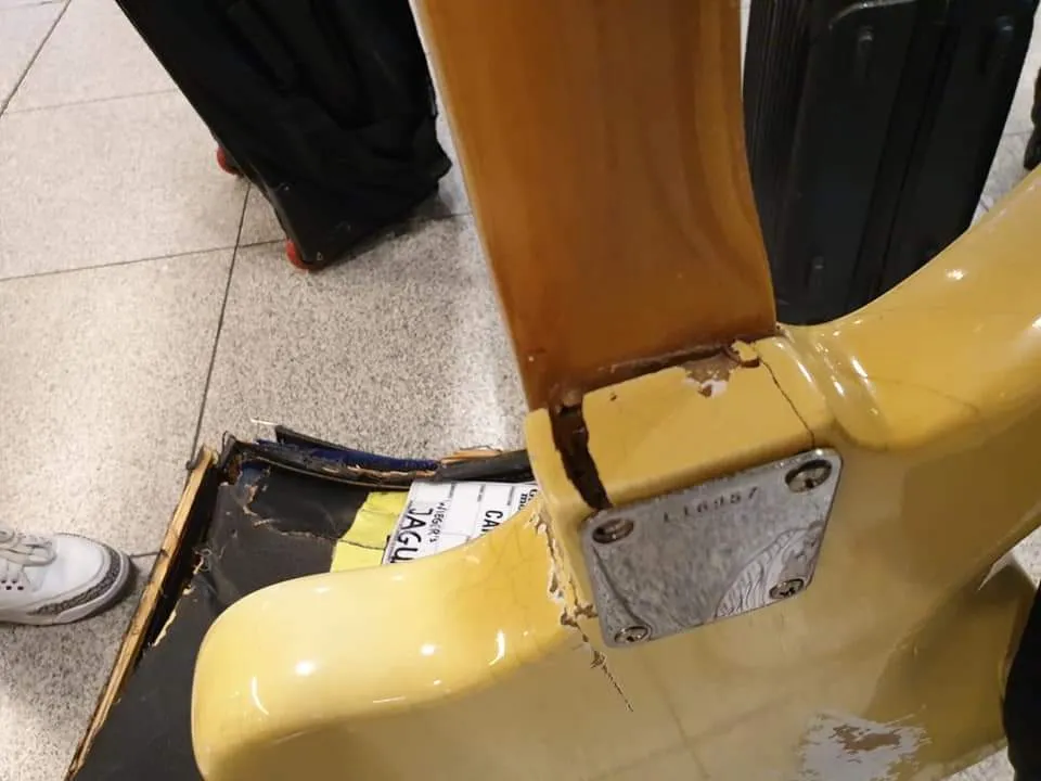 ‘Zo’n instrument wordt toch een beetje een verlengde van je ziel, dus ik wilde ‘m zoveel mogelijk meenemen met Caro Emerald op tour. Als we moeten vliegen, probeer ik mijn gitaren altijd als handbagage mee te nemen, maar negen van de tien keer mag dat niet. Dan dus stickers op de flightcases: “Voorzichtig!” Maar ehm… We landden in Kopenhagen, en de crew kwam naar me toe rennen. “Er is iets verschrikkelijks gebeurd!” Ik schrok, ik dacht dat er iemand dood of gewond was. Maar het ging om mijn gitaar, die in stukken op de band was verschenen. Ik weet niet waar ze het lef vandaan hebben gehaald, ze moeten er echt mee hebben lopen smijten, ik denk bijna dat er een vliegtuig overheen is gereden, zo zag–ie eruit. Iedereen helemaal emotioneel, mijn drummer bijna in tranen, maar ik was letterlijk aan het giechelen: “Ai, kut voor die gitaar, maar het is maar een ding.” Gelukkig heb ik 1000 euro gekregen om hem te repareren, en hij is heel behoorlijk gerepareerd. Maar ja, hij speelt nu wel anders, klinkt anders en zal nooit meer helemaal hetzelfde zijn. Hij voelt fragiel, alsof ik er heel voorzichtig mee moet omgaan.’