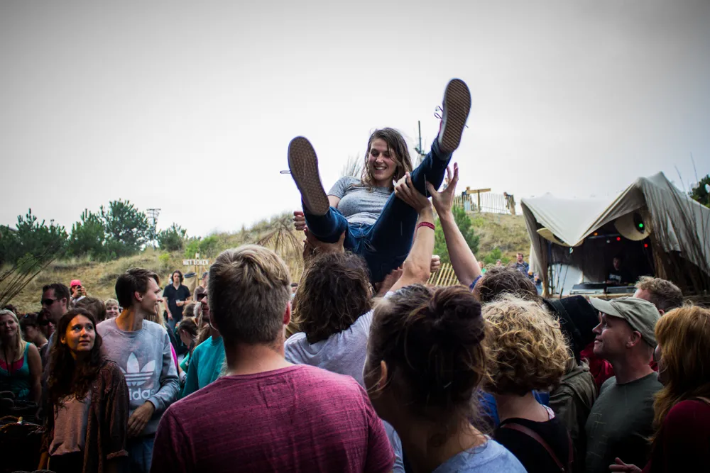 Regen of niet: op de springerigere liedjes wordt vrolijk meegedeind, en sterker nog: er is zowaar een overenthousiaste crowdsurfster.