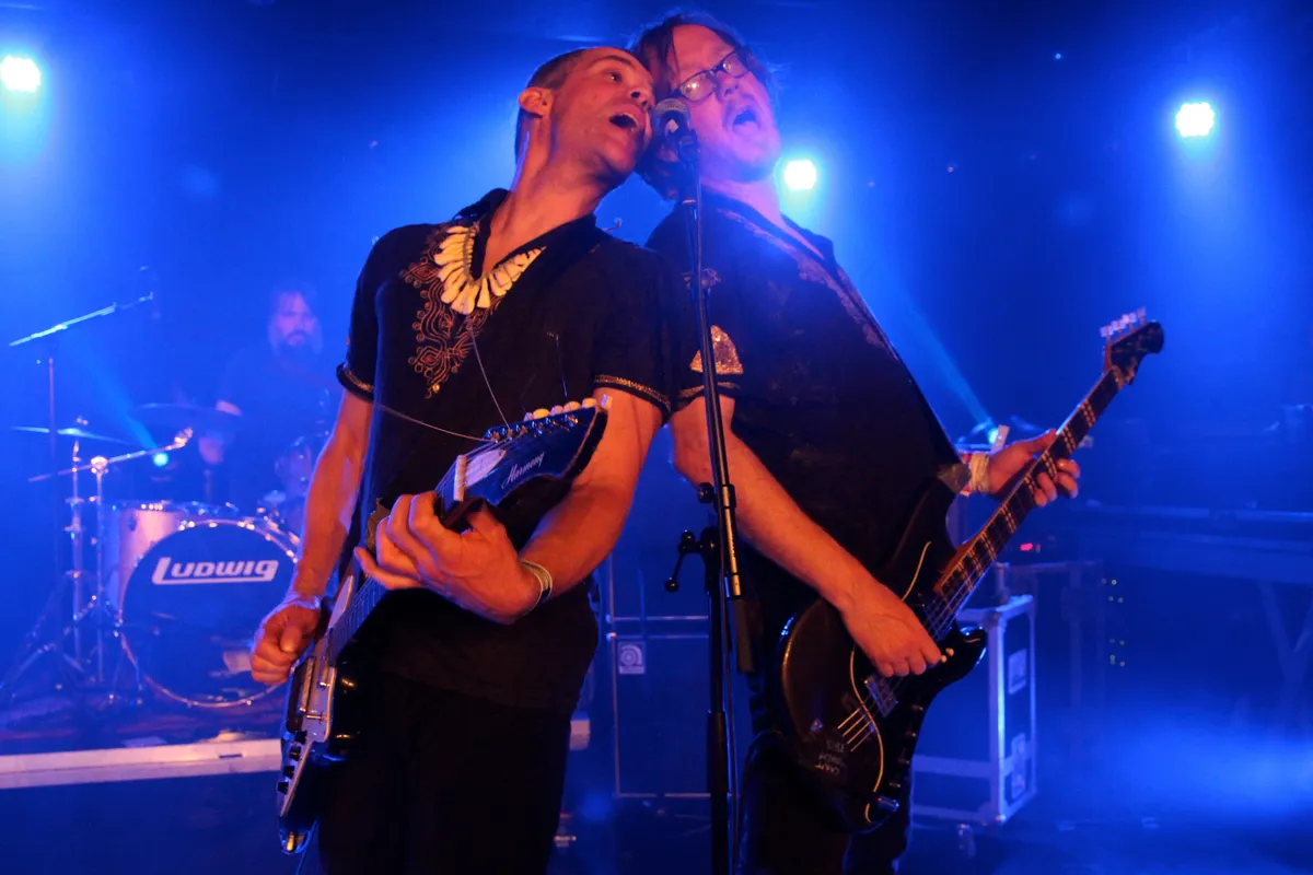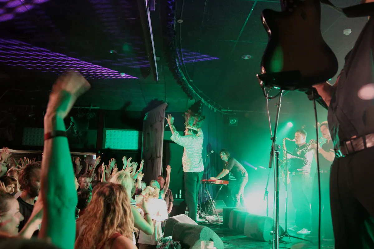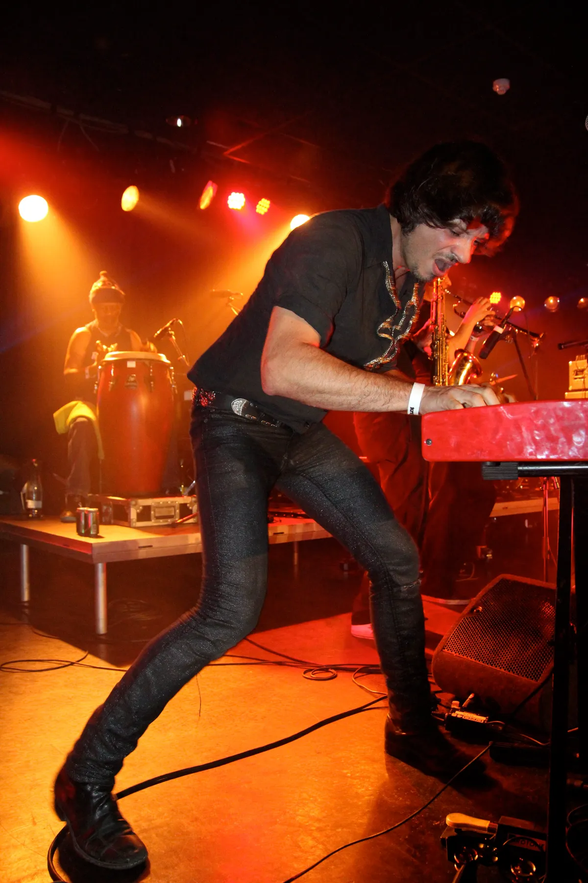 In het derde nummer schieten de veelvuldig met elkaar en bezoekers flirtende gitarist en bassist spelend het publiek door. Nog opmerkelijker is misschien wel het contrast tussen de zeven bijzonder extraverte persoonlijkheden vooraan het podium en de ritmesectie, gevormd door een ijzig stoïcijnse Silent Bob-lookalike achter de drumkit en een eveneens onverstoorbare Afrikaanse krijger op percussie.