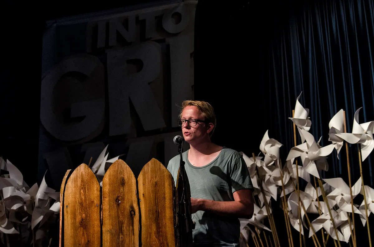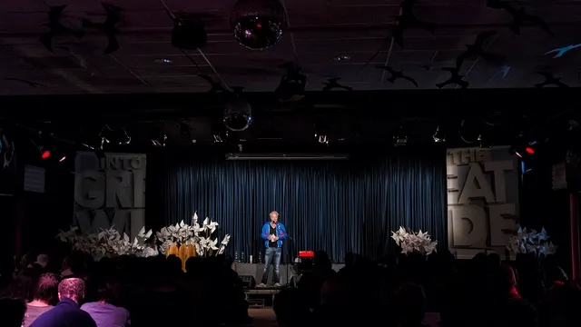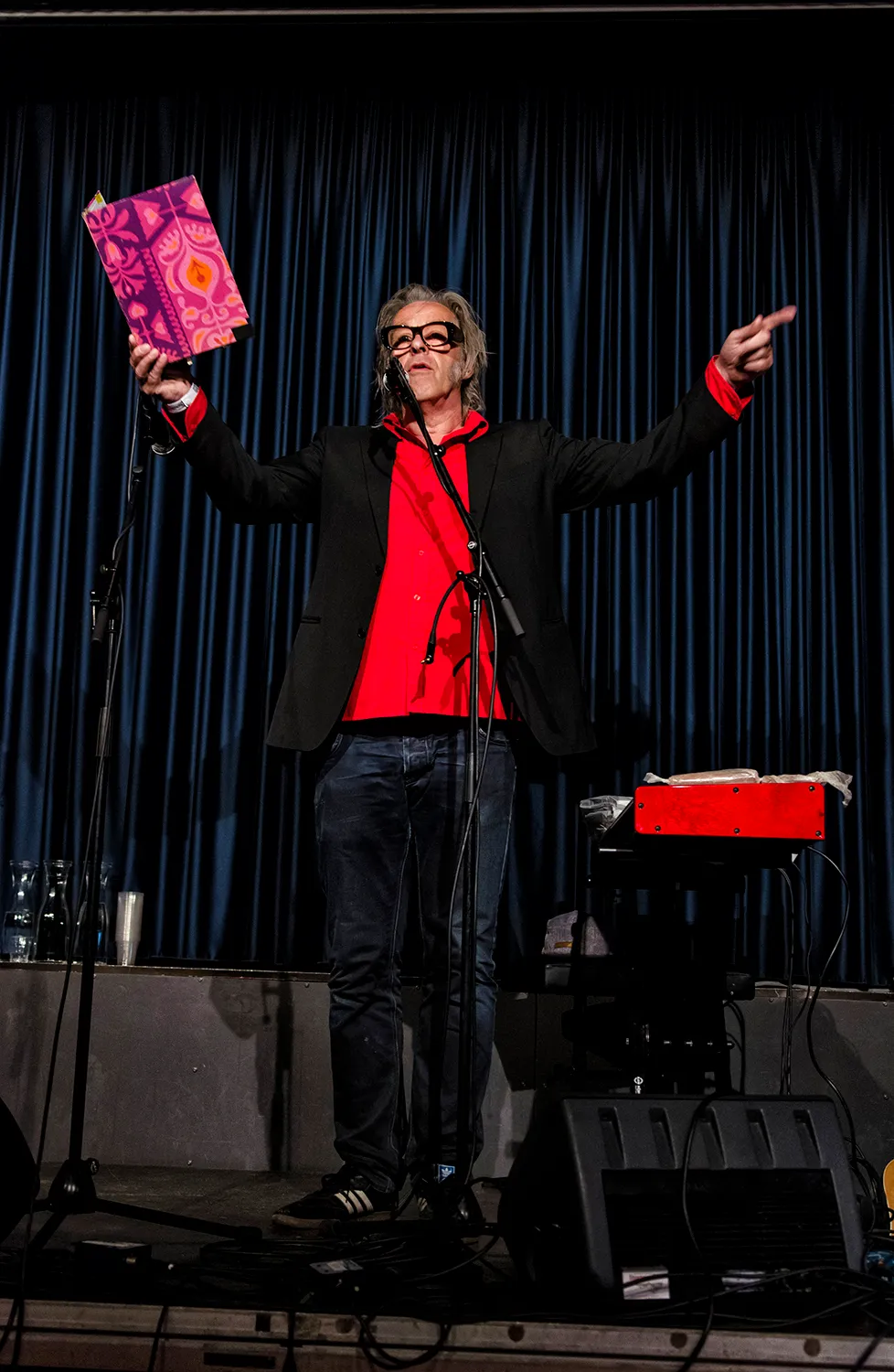 Daarna gaat het snel. Het programma loopt lichtelijk uit, maar dat is niet vervelend. Zo’n ochtend mag tot diep in de middag duren. Thijs Kleinpaste houdt een preek, waarbij hij vertelt over zijn frisse moed om de Bijbel onderuit te halen. Ook spreekt hij over George Orwell. Nyk de Vries, een paar weken geleden nog op Noorderzon in Groningen te zien, draagt Kamer en Carnaval voor. Hij kijkt priemend de zaal in en dat sluit er precies bij aan.