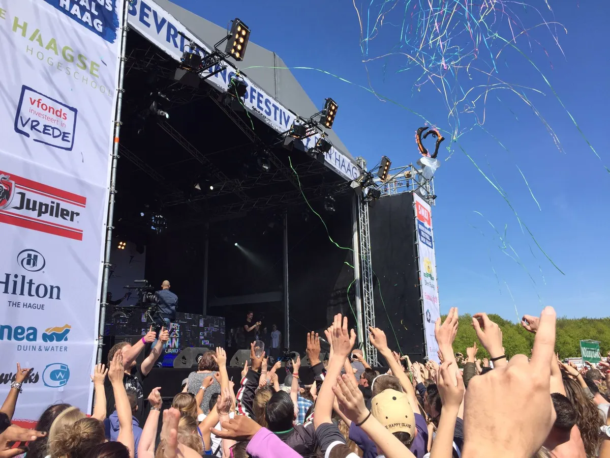 15.43: Confettikanonnen bij Sunnery James & Ryan Marciano op Bevrijdingsfestival Den Haag. 'Koester het, vier het en omarm het'
