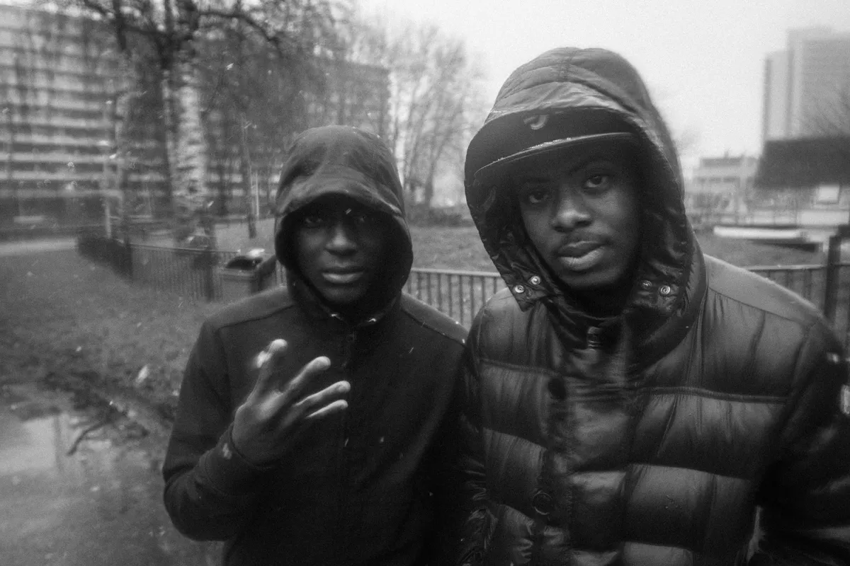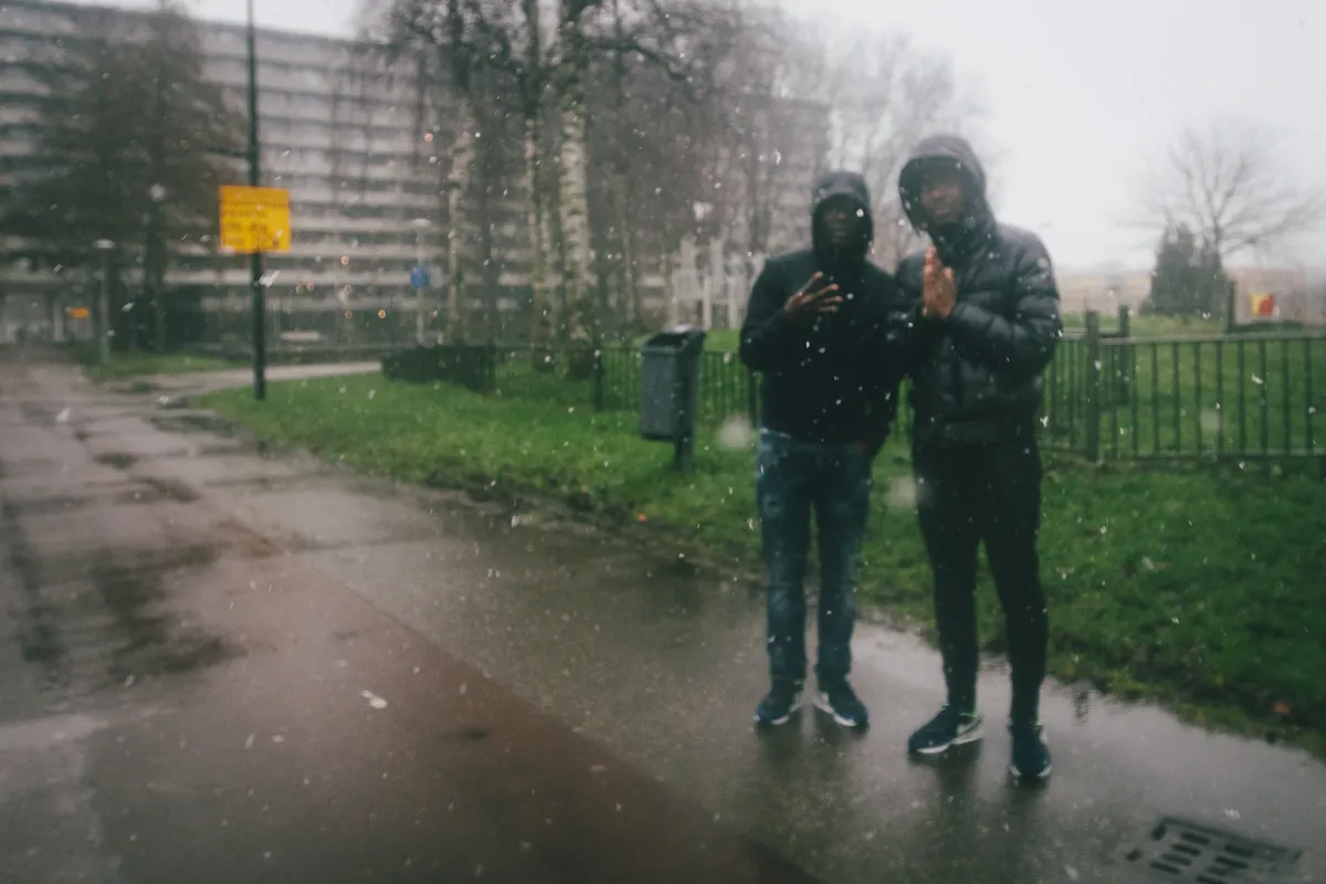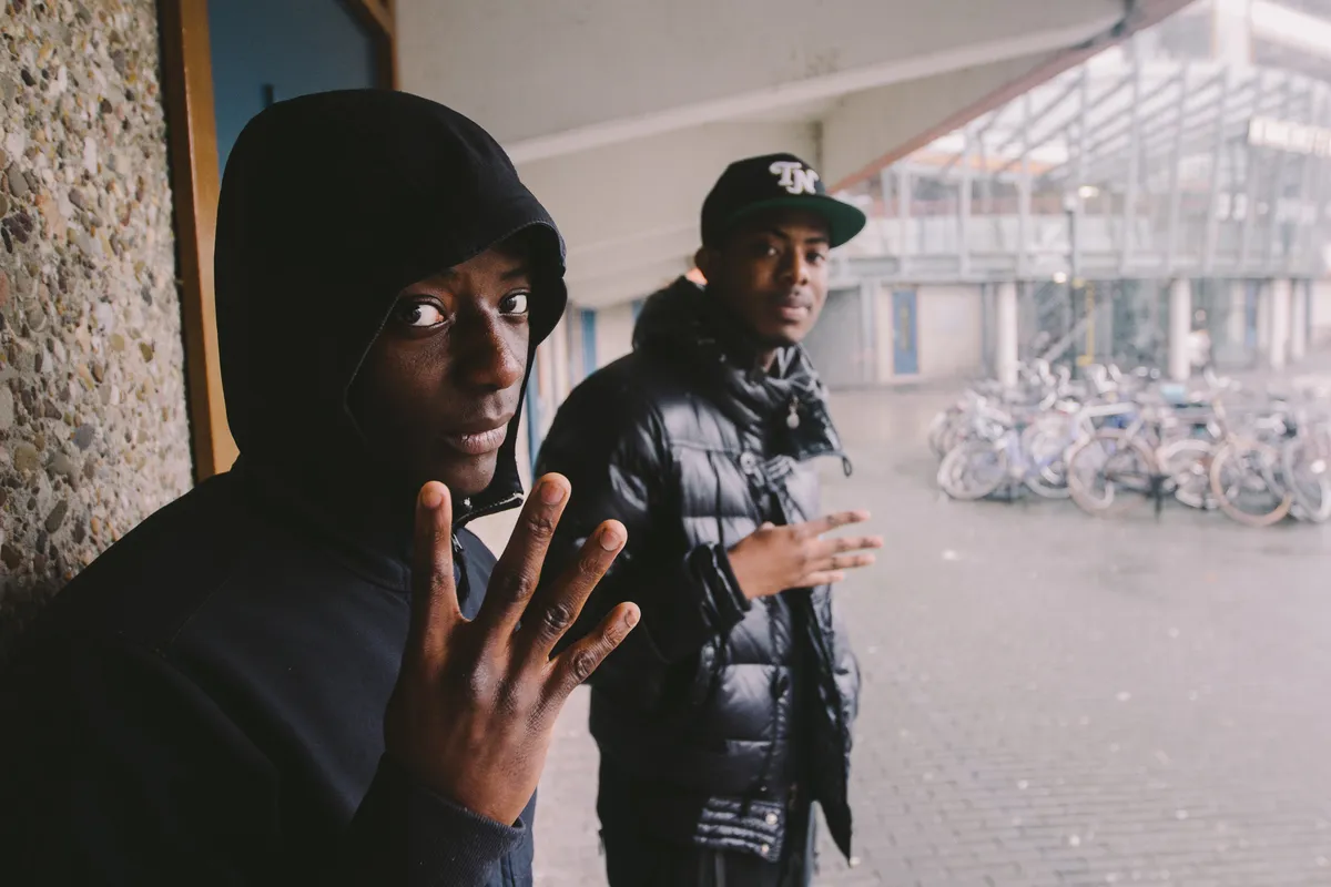 Voor een rondleiding door Kraaiennest is het de allerslechtste dag die je je maar kunt voorstellen, maar Chyvvon Pala (Chivv, 21) en Henk Mando (Henkie T, 21) slaan zich er dapper doorheen. Sterker nog, dat rotweer werkt wel verbroederend voor die twee van SBMG. Ze zijn super-aardig en bijzonder eerlijk over de wijk waar ze opgroeiden, over de schaduwkant ervan maar ook de eendracht waarin al die culturen samenleven. Henkie wijst over het plein. “Kijk, in de tijd dat Hydroboyz upcoming waren, zo rond 2009, liep Mocromaniac hier vaak rond met een stereo in zijn hand. Wij zaten dan te barbecueën en te lachen.” Mocromaniac was zo iemand die vroeg: ‘Yo, wat is er gaande?’, om vervolgens een freestyle te doen van drie minuten, en dat maakte diepe indruk op de jongens van SBMG. “Drie minuten!”, kirt Henkie nog eens. “Voor een buitenstaander doet ie dat niet, hoor, maar voor ons? Sowieso. Muziek heeft ons altijd samengebracht.”