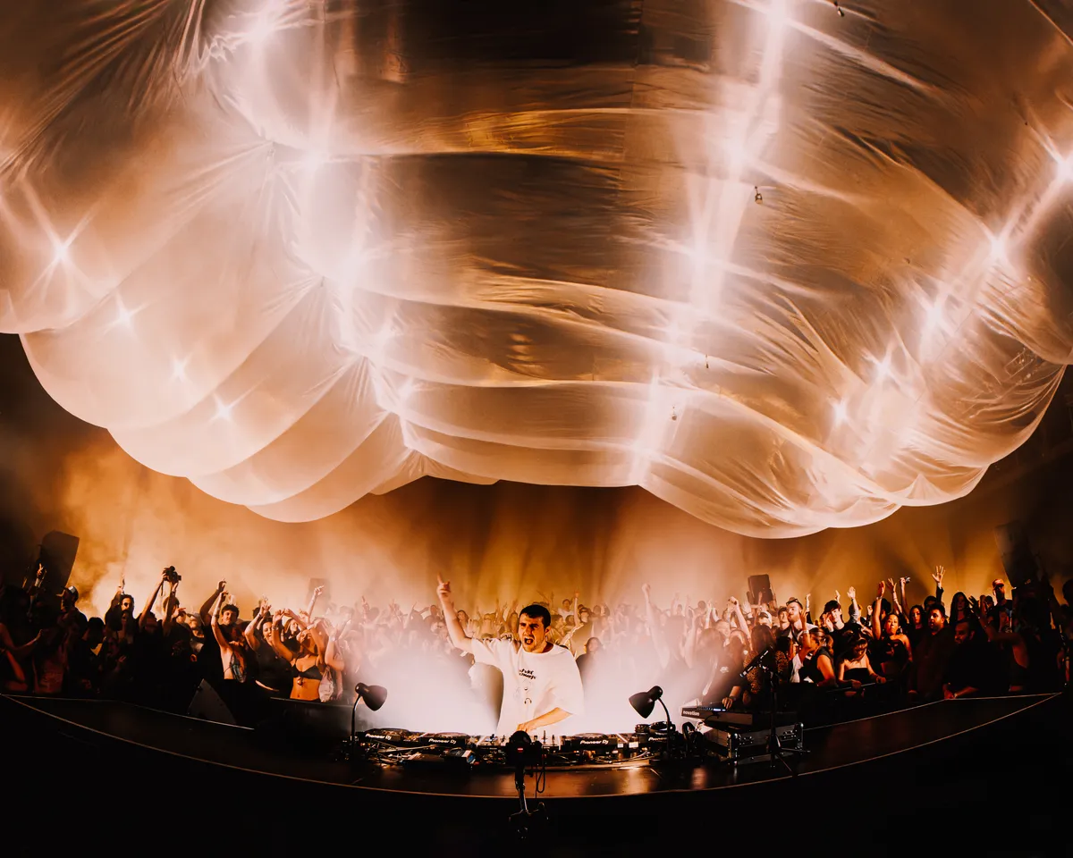 Het moet een bizarre ervaring zijn. 12.000 mensen in een concertzaal, gericht op het podium maar toch ook bewust van het enorme ogenschijnlijk gewichtloze gevaarte boven ze. Ergens onder het golvende oppervlak staat Fred again.., zijn laptop, synths en drumcomputer als motor van een vijf uur durende dance nacht. Het kunstwerk dat boven hem hangt lijkt zijn eigen wetten te hebben. Het heet Einder, een zwevend doek van twintig bij zestig meter, bedacht door de Nederlandse kunstenaar Boris Acket. Het moet niet voelen als een decorstuk of lichtshow, maar echt als een levend organisme. ‘Het hele werk gaat eigenlijk over vallen,’ vertelt Acket. ‘Maar we konden het niet laten vallen, omdat de natuurkunde tegen ons was.’