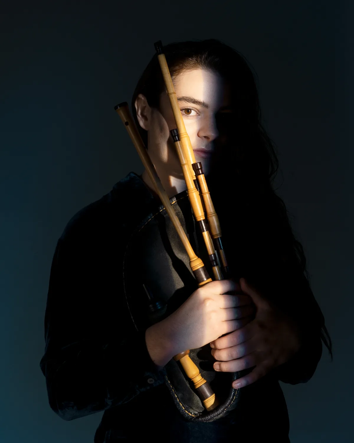 Haar wapen van keuze: de Schotse smallpipes, een veel onbekendere variant die niet met de mond wordt aangeblazen, maar aangepompt met de ellenboog, en die wat kleiner en stiller is en zich beter leent voor samenspel dan de grote doedelzak. Wat haar zo raakt aan de klank? ‘De drone van de smallpipes is hypnotiserend,’ vertelt ze dromerig. ‘Ik vóél het in mijn lichaam vibreren, als ik speel word ik naar een andere wereld getransporteerd. Het klinkt lichtjes elektronisch. Na shows komen mensen naar me toe: “Ik heb überhaupt nooit bij de doedelzak stilgestaan, maar door jou gaat er een wereld voor me open.” Díé wereld wil ik laten zien.’