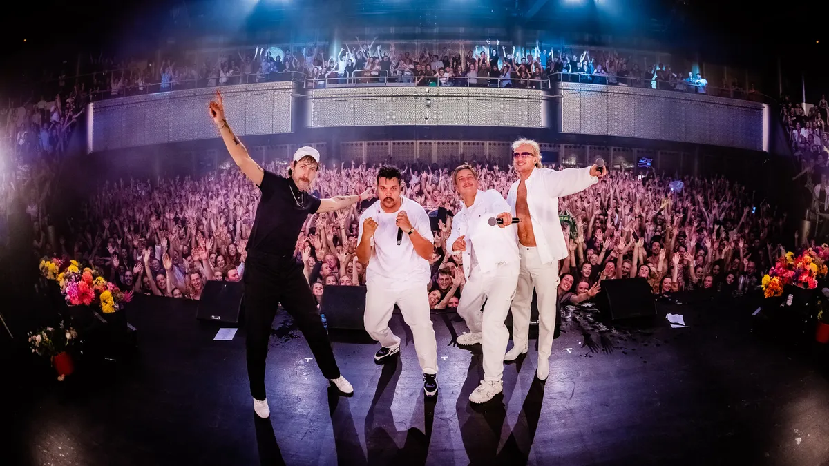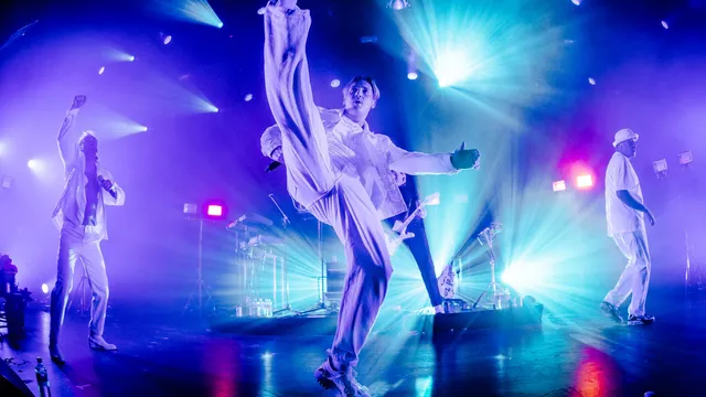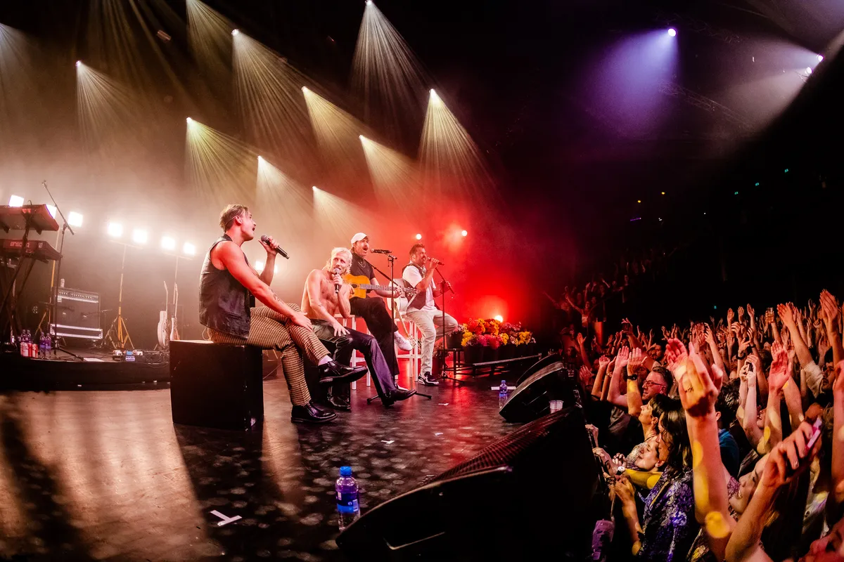Een Goldband show is een opeenstapeling van knipogen. Die entree doet denken aan de larger than life podiumproducties van Kanye West, even later oogt het trio als een boy band. Er wordt volop gespeeld met de conventies en clichés van live shows zoals we ze voor corona kenden, en er worden genres door elkaar gemikt die op het eerste gezicht niets met elkaar te maken hebben. Wie is er in godsnaam op het idee gekomen om jaren tachtig pop in je moerstaal liedjes à la Hans de Booij en Toontje Lager te combineren met 90s trance? Dat slaat op papier helemaal nergens op, en toch werkt het. Milo, de man met de geblondeerde mat, is zonder meer de blikvanger van de groep, maar Boaz is veruit de beste zanger van het stel. Als hij uithaalt reikt ie tot achter op het balkon, en dat lukt de andere twee zeker niet altijd.