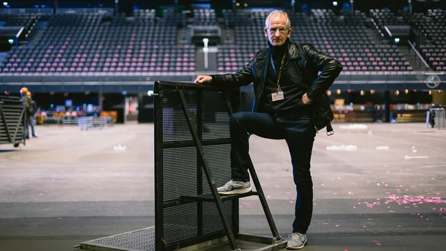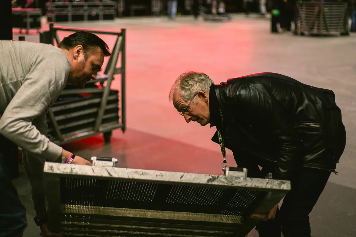 ‘Kijk, je pakt ‘m hier vast…’ Met de behendigheid van de kwiekste podiumbouwer haalt MOJO-directeur John Mulder (63) een flink dranghek uit het krat. ‘En dan klap je hem zo…’ Klik. Klak. Hoplakee. Et voilà, binnen een minuut staat daar het wereldberoemde hekje in zijn volle glorie. We zijn net de zaal van Ziggo Dome binnen gelopen, waar vanavond The Killers zullen spelen en zo tientallen hekwerken voor het podium worden opgebouwd. John kijkt nog eens trots naar het hekje, zet zijn voet op het aluminium trapje en poseert voor de camera. ‘Ziet er goed uit, zo?’
