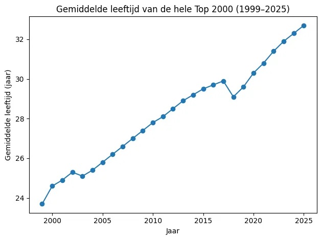 Toch is er buiten de absolute elite wel degelijk nieuwe aanwas. Kijk maar mee. Op het eerste gezicht lijkt het alsof de lijst alleen maar vergrijst: in 1999 waren alle liedjes samen gemiddeld 23,7 jaar oud. In 2010 was dat al bijna 28 jaar. In 2020 ging de gemiddelde leeftijd voor het eerst over de 30 heen, en in 2025 zitten we op 32,7 jaar. Zie je wel: 9 jaar ouder.