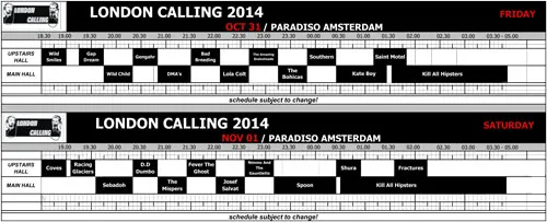 Het blokkenschema van London Calling is bekend, bekijk hem hieronder. Opvallend is dat Kate Boy maar liefst 1,5 uur speelt. Eerder deze maand maakte London Calling twee nieuwe namen bekend: Wild Smiles (Westcoast pop uit Southampton) en het Australische trio DMA's komen naar Amsterdam. De organisatie slikte een tegenvaller toen zowel Phantogram als John Wizards de najaarseditie annuleerden. Eerder werden o.a. Josef Salvat, The Amazing Snakeheads, Sebadoh, Spoon, Wild Child, Kate Boy en Coves bevestigd. De tweede London Calling in 2014 vindt plaats op vrijdag 31 oktober en zaterdag 1 november, uiteraard in Paradiso.