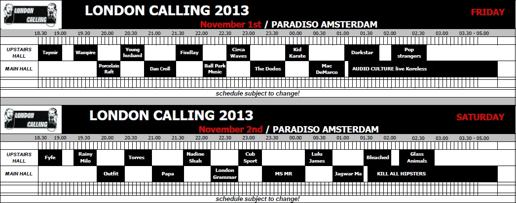 Drie nieuwe namen: Dan Croll en Younghusband komen op vrijdag naar Amsterdam en Glass Animals op zaterdag. Het festival kampt ook met drie afzeggingen: Ruen Brothers, Wolf Alice (vrijdag) en Thunderbird Gerard (zaterdag) komen niet. London Calling heeft ook het nachtprogramma rond: Audioculture presenteert de vrijdagnacht (o.a. Koreless) en zaterdagnacht is er Kill All Hipsters.