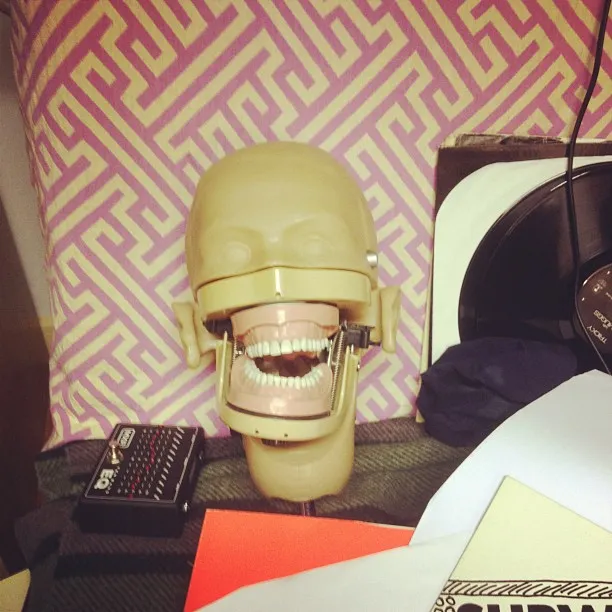 “Dit is in onze studio in Londen. Dave verzamelt een hoop, eh, hoofden. Van mannequins enzo. Volgens mij heeft hij deze van zijn tandarts, die ging verhuizen en Dave was één van zijn vaste klanten. Hij heeft toen gevraagd of hij ´m mocht hebben, of hij heeft ´m gewoon gekocht. Er liggen veel hoofden en maskers in onze studio.”