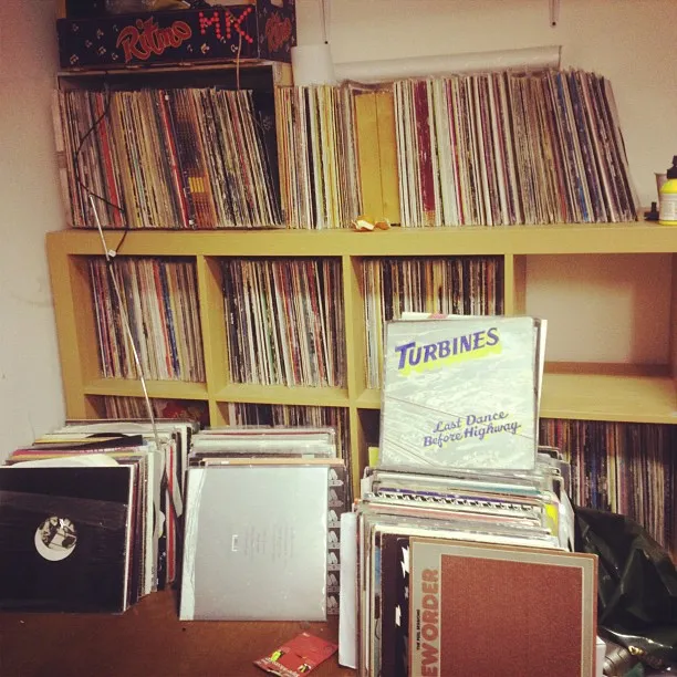 “Dit is al het vinyl van Dave in onze studio. Wij hebben de rest van onze platencollectie thuis, anders zouden we een extra steunbalk moeten hebben in onze studio denk ik. Hij gaat er naar op zoek in tweedehands winkels, en verzamelt maar verkoopt ook vinyl. Het is handig als je samples nodig hebt of als je ideeën nodig hebt als je in een creatieve strop zit. Dan trek je een plaat uit de kast en kijk je hoe anderen het doen. We zijn niet bang om ideeën van anderen gebruiken. In de meeste muziek kun je namelijk niet echt nieuwe dingen creëren, wij begrijpen dat. Het is handig om alles binnen handbereik te hebben als je aan iemand wil uitleggen wat je bedoelt. We proberen om naar platenzaken te gaan in elke stad die we aandoen, om te kijken wat we kunnen verzamelen. Het doet altijd pijn in je portemonnee, maar zo gaat dat!”