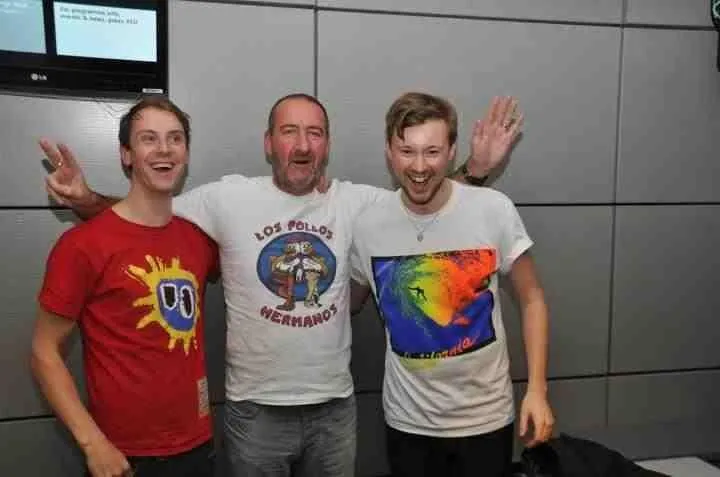 “Dat is Marc Riley, hij werkt bij BBC Radio 6 Music. Hij speelde vroeger in de postpunkband The Fall en was Mark E. Smiths bassist. Jim en ik waren een paar weken geleden op bezoek voor een sessie. Hij heeft ons van begin af aan bijgestaan en we gaan om de zoveel tijd terug daar om iets te doen. De andere twee bandleden, toetsenist Tommy Grace en drummer David Maclean, lagen te slapen in het hotel dus wij moesten het waarmaken. Riley is een toffe peer. Hij neemt je ook de hele tijd in de maling. We zijn nu al een keer of vier, vijf te gast geweest maar het wordt nooit makkelijker. Als hij begint met praten zegt hij meteen iets waardoor je ineens je hele leven aan je voorbij ziet gaan, haha. Hij gaat naar iets van vier gigs per week, en hij is al in de vijftig dus dat is echt veel. Het is raar om hem op YouTube te zien in interviews en hem horen praten over Mark E. Smith en wat voor een achtbaanrit het in die band zitten geweest moet zijn. Als Mark het niet zinde wat je speelde, trok hij de stekkers er gewoon uit. He’s been there and done that, een coole gozer.”