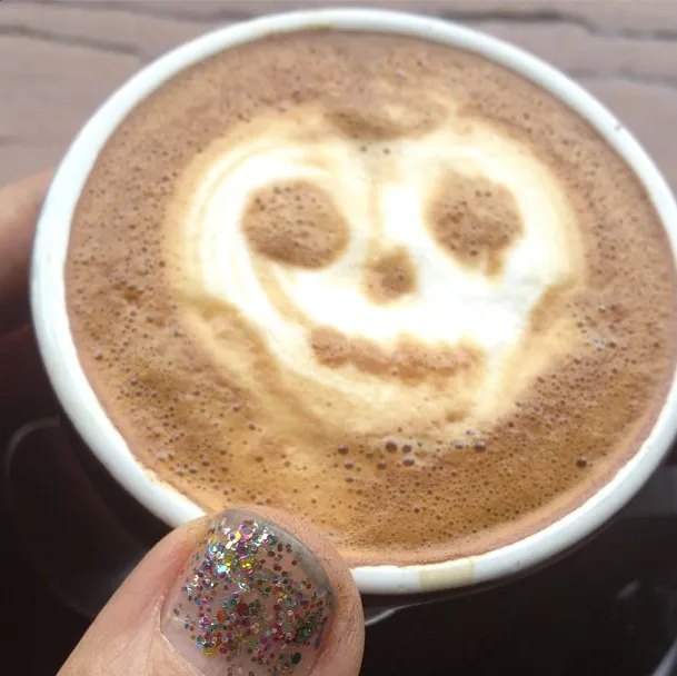 "De obers in koffiebarretjes doen altijd ongelofelijk hun best, maar hun creativiteit laat te wensen over. Het is toch vaak een hartje of een blaadje, dus ik herschik het vaak als een schedel, net alsof zij dat gedaan hebben."
