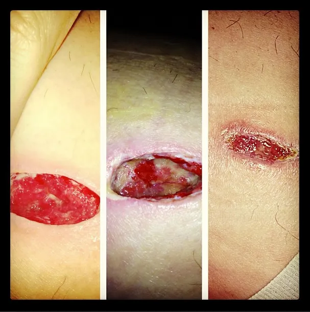 "Ja, het duurde weken, ik vond het heel interessant. Ik heb echt lang in mijn eigen been zitten kijken. Ik ben gefascineerd door dingen die er raar uit zien, en dit zag er heel raar uit. Wonderlijk ook hoe het herstelt. Je zou zeggen dat er een enorm litteken overblijft, maar je ziet nu niet meer dan een klein roze plekje."