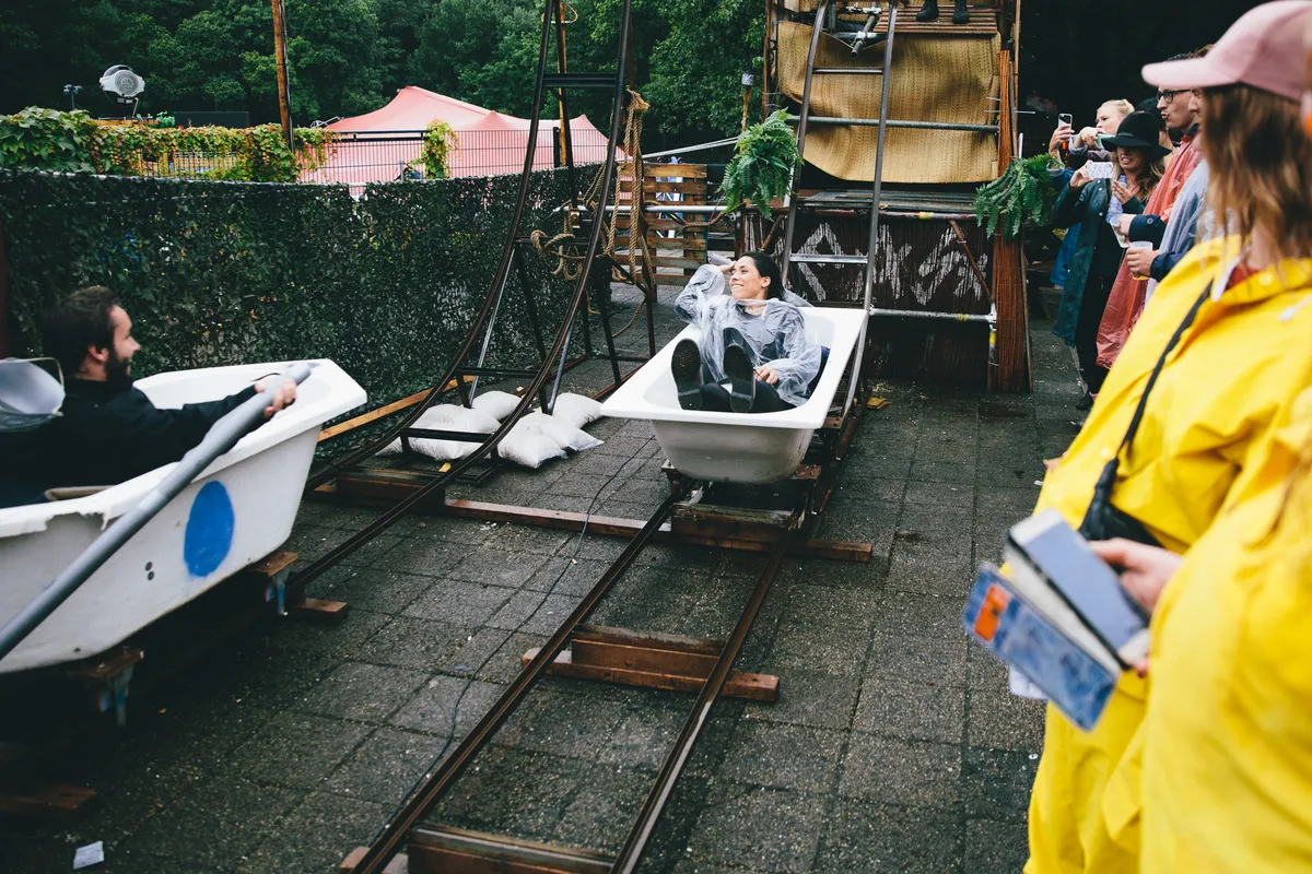 Die kleurrijke gekkigheid is wat Into The Woods al jaren zo leuk maakt. In de afgelopen acht jaar is het festival in het Amersfoortse bos uitgegroeid tot een kleurrijke kermis met in ieder hoekje wat te beleven, nog meer officieuze podia dan officiële. Hier staat een tent waar paaldansers hun billen schudden op moombathon en reggae, daar een taco-tent met een afdakje waar oldschool hiphop wordt gedraaid en even verderop twee rails met badkuipen waarin je tegen elkaar kan strijden. Ja, zo bizar is het allemaal. De afgelopen editie is – met twee keer 10.000 man – in een zucht en een scheet uitverkocht, hoewel er last-minute wegens het kutweer natuurlijk een paar honderd kaartjes voor bodemprijzen op Ticketswap staan.