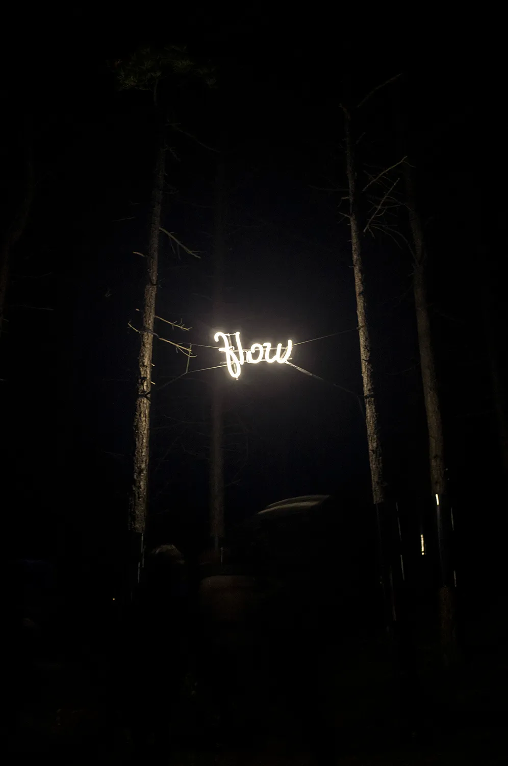 Verderop aan het pad ligt 'Fairytale' van Paul Baartmans. Een collectie van reflectoren, gemonteerd op de bomen. In de kruin hangt het woord 'flow' of 'wolf', als je van de andere kant komt. Overdag schijnt het volgens Dijkman mooier te zijn dan 's nachts.