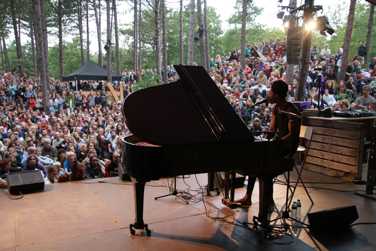 Hij is een artistieke clochard, deze Benjamin Clementine. Hij trok vanuit Engeland naar Frankrijk en leefde in Parijs een zwervend bestaan, vertelt het verhaal. Voor de kunst, zo lijkt het. De Kunst met een grote K, achter de vleugel. Muzikaal brengt hij een mengeling van melodieuze klassieke muziek, jazz en Randy Newman-achtige pianopop. Het wachten is op een album, maar ook twee EP's zijn al genoeg om het bospodium helemaal vol te trekken.