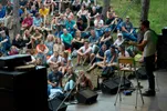 Een wokpan, een cassettespeler en een batterij aan gitaarpedalen: Ingrediënten voor de experimentele jazzimprovisatie van Dans Dans. Ze worden niet graag als jazz bestempeld zeggen zij vooraf: “Mensen horen de term jazz en denken, 'dat is niets voor mij.' Terwijl zij onze muziek in de praktijk wel kunnen waarderen.” De angst dat publiek weg zou blijven blijkt ongegrond. Dans Dans speelt op het Bospodium, dat ligt in een kuil. Het voelt aan als een soort amfitheater en het is ramvol. Bijna iedereen zit, luistert en is muisstil.