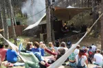 "I'm so happy to be here", bekent Lonnie Holley. "From shoreline to shoreline, trying to get over the mountains... Mother earth has been so good for us, so i say: mother..." Het verhaal (gedicht?) van de 64-jarige kunstenaar gaat wat verloren, maar de boodschap is - zeker hier op deze kwetsbare boslocatie - zonneklaar: wij als mensen mogen maar wat blij en voorzichtig zijn met wat moeder aarde ons geschonken heeft. Amen. Holley is een wat zonderling ogende Amerikaanse artiest, verstopt onder een vissershoed waar we onder meer een zeeschelp, slakkenhuis, vergrootglas, US vlag en kruis in Jamaicaanse kleuren op ontwaren. Tel daar die halve laarzen, en bonte collectie armbanden en ringen bij op en Holley zou zo als Vlielandse strandjutter door het leven kunnen.