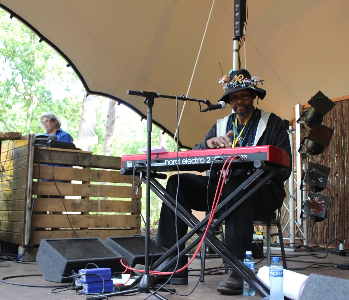 Zijn geluidssculpturen zijn niet zo bizar, maar wel erg abstract. De man uit Birmingham, Alabama hamert wat op de toetsen, declameert teksten met rauwe, bluesy strot en die gitarist probeert hem te volgen. Wij ook trouwens. Soms intrigerend en betoverend, maar het valt wel op dat er erg weinig mensen op afgekomen zijn. We eindigen met het tweestemmige "I'm On A Timeline" en resumeren: Een bijzondere, bonte vogel op een bijzonder en bont festival. (Ingmar Griffioen)