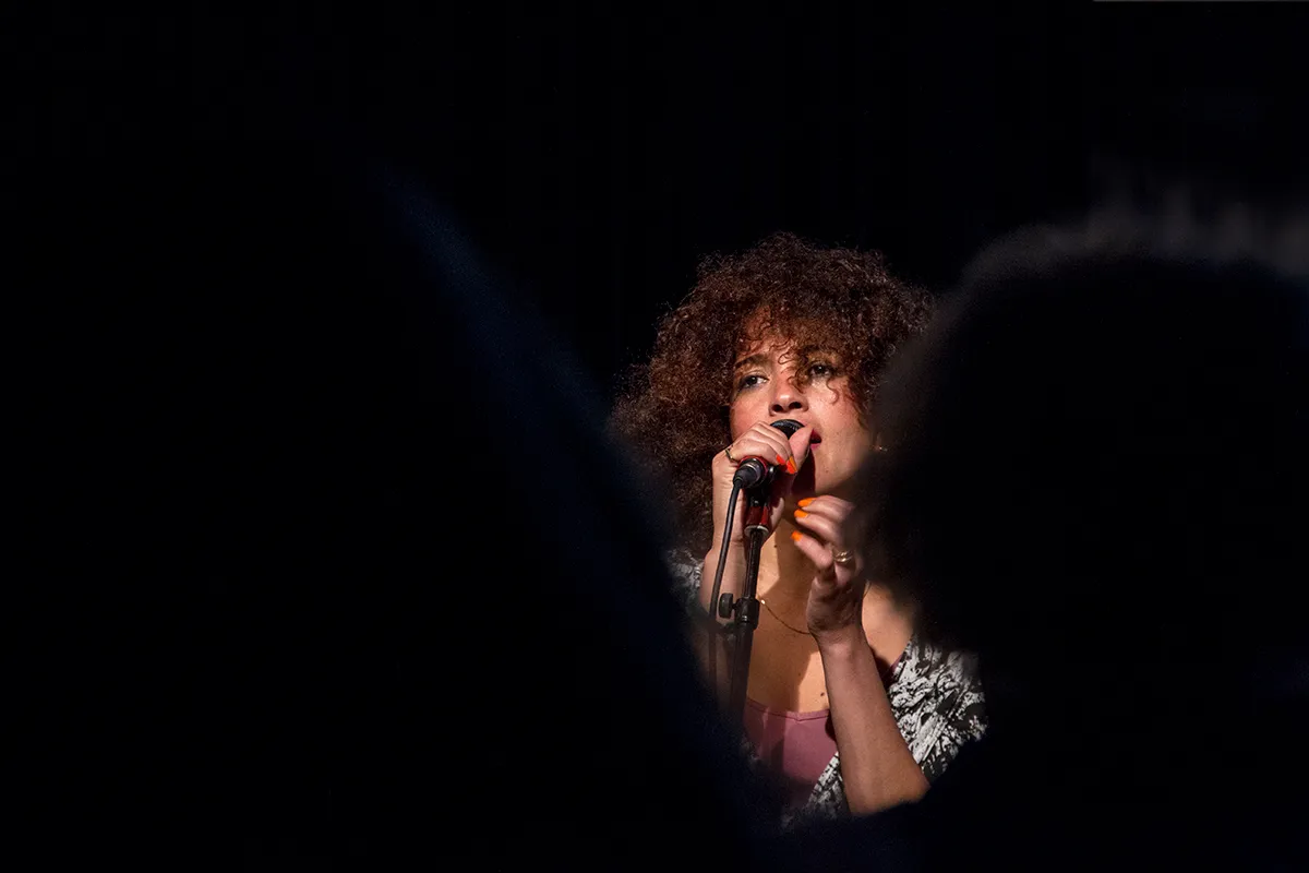 Licht blijft het nog wel eventjes: Arne Hendriks’ pleidooi dat de gehele mensheid gekrompen moet worden naar 50 centimeter hoogte werkt bij het grootste deel van het publiek vooral op de lachspieren. Een goed punt heeft hij wel, als je bekijkt dat het ons zo’n 95% aan lichaamsenergie zou besparen, wat weer leidt tot een langer leven – en dan laten we de verkleinde carbon footprint nog buiten beschouwing. Dat zijn boomlange verschijning plaats maakt voor de toch al niet grote Typhoon kun je beschouwen als een mooi stukje ironie. Typhoon is nog niet helemaal wakker, maar ook gefrustreerd: de huidige generatie laat alles maar over zich heen komen, terwijl we worden beroofd van onze privégegevens en pensioengeld. Zijn anekdote over hoe hij weigerde zijn vingerafdrukken af te staan voor een paspoort wekt bewondering, maar het is vooral zijn sterk gebrachte gedicht over alles dat misgaat in onze samenleving dat indruk maakt. De rapper is gewoon beter als er wat metrum in zijn verhaal zit.