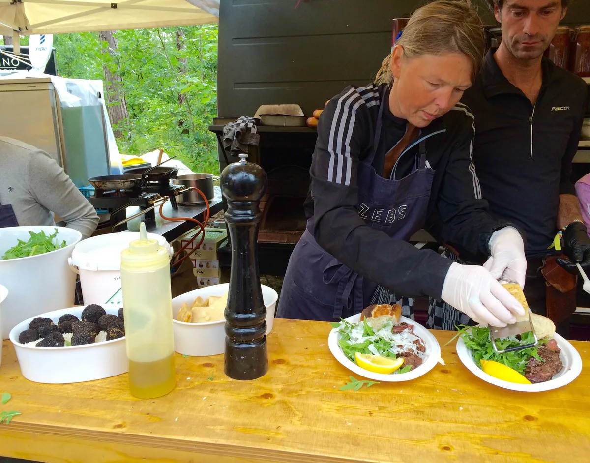 Op Into The Great Wide Open hoef je geen slap bordje pasta te verwachten, op het Sportveld worden uitmuntende Italiaanse gerechten geserveerd. Wellicht verwarrend voor de culinaire leek, maar aan de traditionele tagliata komt geen pasta te pas: we spreken hier van dunne plakjes, heerlijk mediumrare geroosterde Angus biefstuk met een prima salade van lekker knapperige rucola, een puntje citroen, olijfolie en grove korrels zeezout. Pluspunten voor het voor de neus raspen van de dikke vlokken parmezaan die als sneeuwvlokken over de steak dwarrelen. Het is bij lange na niet genoeg voor een volle maag, maar desalniettemin een grote aanrader. Locatie: Sportveld Munten: 4 Cijfer: 8,5 (Timo Pisart)