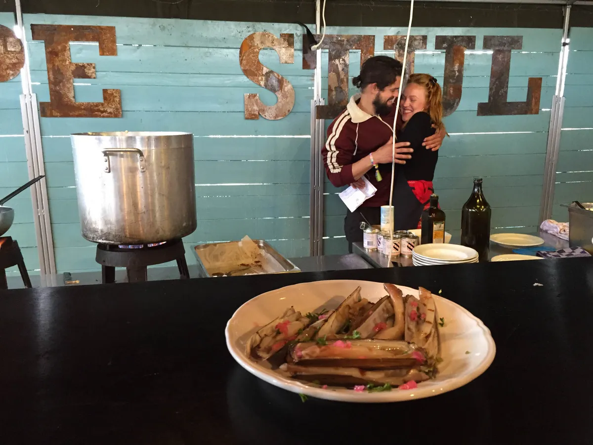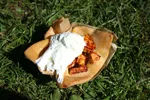 De absolute klassieker van Zijpe Stijl. Eenmaal scheermesjes, is elk festival scheermesjes, ook al vullen ze natuurlijk voor geen meter. Acht van die beestjes krijg je, geserveerd op een aardewerken bordje, en voorzien van een dressing van azijn, olijfolie en rode uit. Slobber slobber en het is weg, maar wat een verademing na de zilte kapsalon waarmee Zijpe Stijl ons op Lowlands hoopte te verrassen. En let op: elke keer als je er een bestelt, komen er minimaal drie mensen op je af die zeggen: "Oh, die zijn zooo lekker." Eén minpuntje: ze grillen ze tegenwoordig in een oven in plaats van op de bbq, en dat proef je. Evengoed de ultieme must taste. Locatie: Fortweg Munten: 2,5 Cijfer: 9