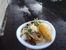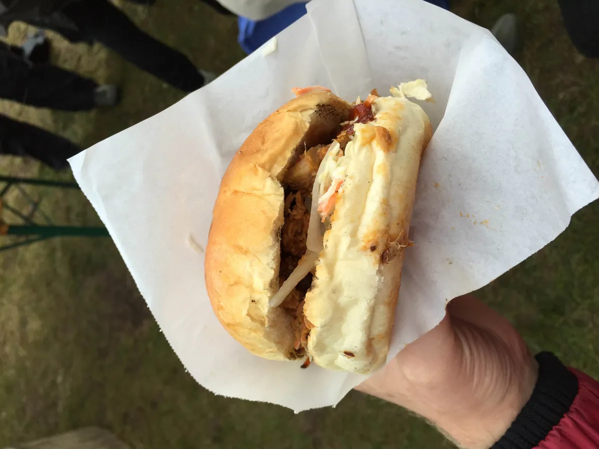 De term ‘burger’ is bij dit gerecht een beetje misleidend: het is simpelweg een broodje pulled pork (bij ons in Oost-Brabant noemden we dat vroeger gewoon vêrkeh). Met een portie koolsla en barbecuesaus erbij, zoals het hoort. Niks mis mee: prima rooksmaak, niet te droog, lekker gekruid. Wel zou die salade iets minder triestig kunnen. Een praktisch nadeel: je moet hem echt volledig horizontaal naar binnen schuiven, anders druipt de hele inhoud eruit. Een stelletje bij het barbecuetentje nabij het Fortwegpodium heeft dat bijvoorbeeld niet begrepen. Samen proberen ze er een te eten, romantisch in de regen. Helaas wordt het op deze manier toch een beetje pulled pork-porno. Locatie: Fortweg Munten: 3 Cijfer: 7+ (SH)