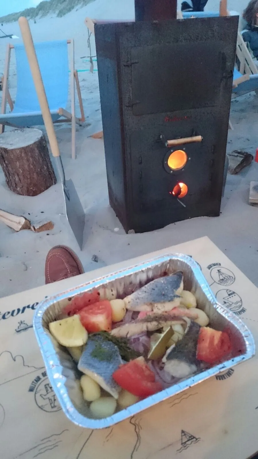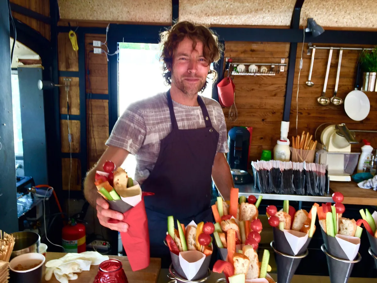 Vlak voor de start van Into The Great Wide Open dreigde een springtij vanuit de Noordzee een voortijdig einde te maken aan het paradepaardje van 2015: strandtuin Weltevree. Voor dit ecologische initiatief zijn Lab Vlieland, restaurant Hoog Vuur en duurzaam productlabel Weltevree met elkaar in zee (en dus bijna de boot in) gegaan. Ternauwernood konden de in het strand ingegraven koelkelder, de windmolens en de hottubs de voeten droog houden. Klanten moeten zelf aan de slag voor hun diner door een bakje vlees/vis/vega te bakken in een van de vele houtovens die rond het eetgedeelte opgesteld staan. Gelukkig lopen er wel koks met verstand van zaken rond om supervisie te houden, want de oventjes denken heel verschillend over de gestelde twee minuten baktijd. Het eindresultaat is een verfijnd, maar licht kostje: drie stukjes verschillende vis (dagvangst) op een bedje van lekker gekruide, niet-standaard groenten (zeekraal, venkel etc). Ondanks dat de prijzen ietwat aan de hoge kant zijn, loopt van Strandtuin Weltevree het water je in de mond. Locatie: Strand bij De Bolder Prijs: 15 Euro Cijfer: 8 (Roosmarijn Reijmer)