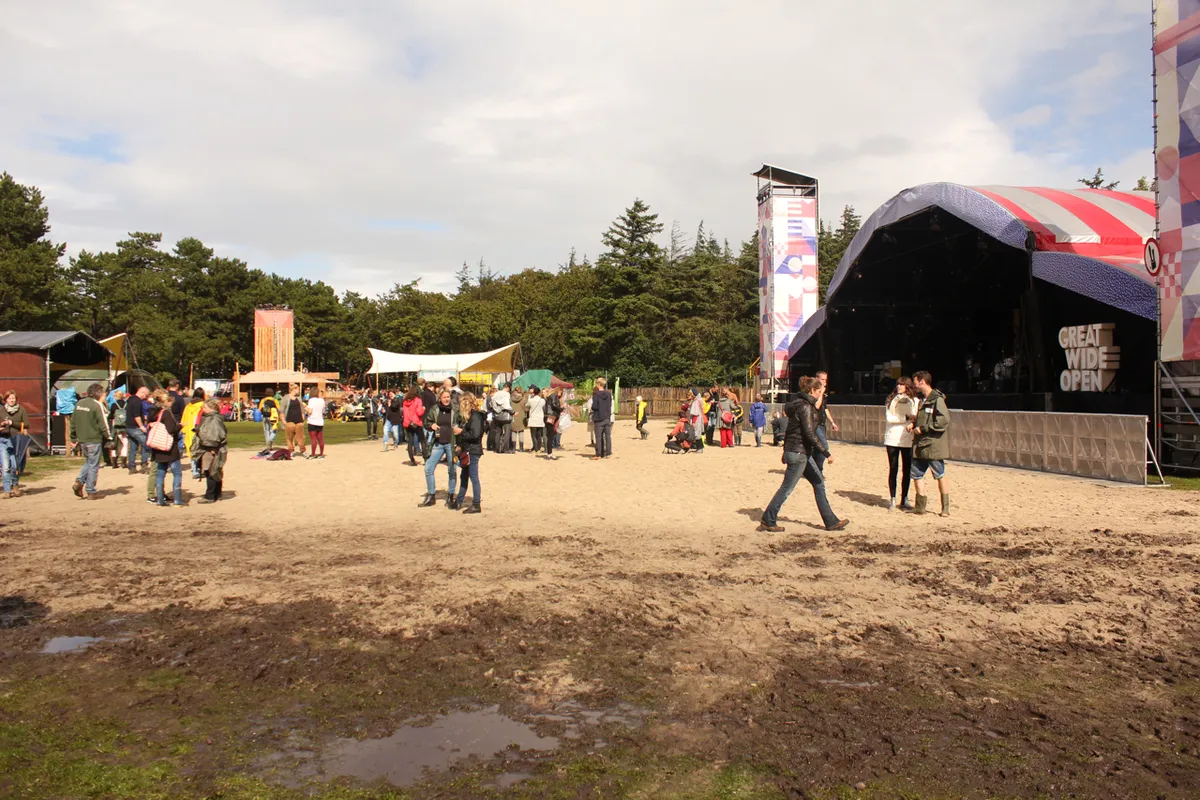 Het is een af- en aankomen van vrachtwagens vol zand, backstage bij het Sportpark op Into The Great Wide Open. Het is nodig ook, want het is een waterballet op deze vrijdagochtend. Een groot gedeelte voor het hoofdpodium is afgezet en medewerkers zijn in de weer om gaten in de grond te prikken zodat het water verder naar beneden sijpelt.