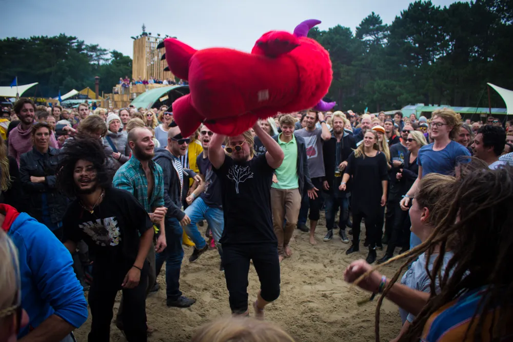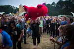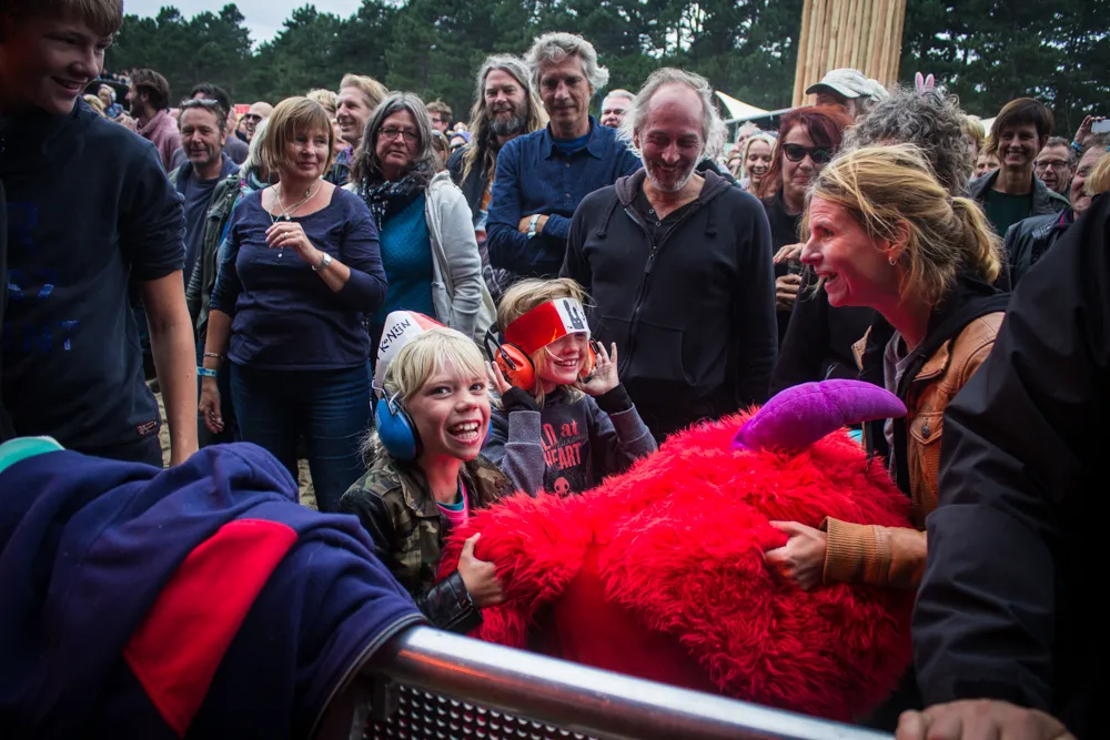 Waar komt opeens dat gigantische rode, pluizige knuffeldier vandaan? Hij vliegt over de hoofden van het publiek, belandt even op het podium en vervolgens in de pit.