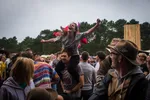 Er is een grote vriendelijke pit van aardig wat oudere tieners die de veertig gepasseerd zijn, maar de jongere generatie is net zo goed vertegenwoordigd. Er gaat een jongen lachend en rollebollend door het zand, groepen meisjes die nog in hun tienerjaren zijn staan te hossen. Eentje klimt in de nek van een vriend terwijl er een jointje rondgaat. Kortom: dolle pret, hoewel het Sportveld ook niet écht vol is.