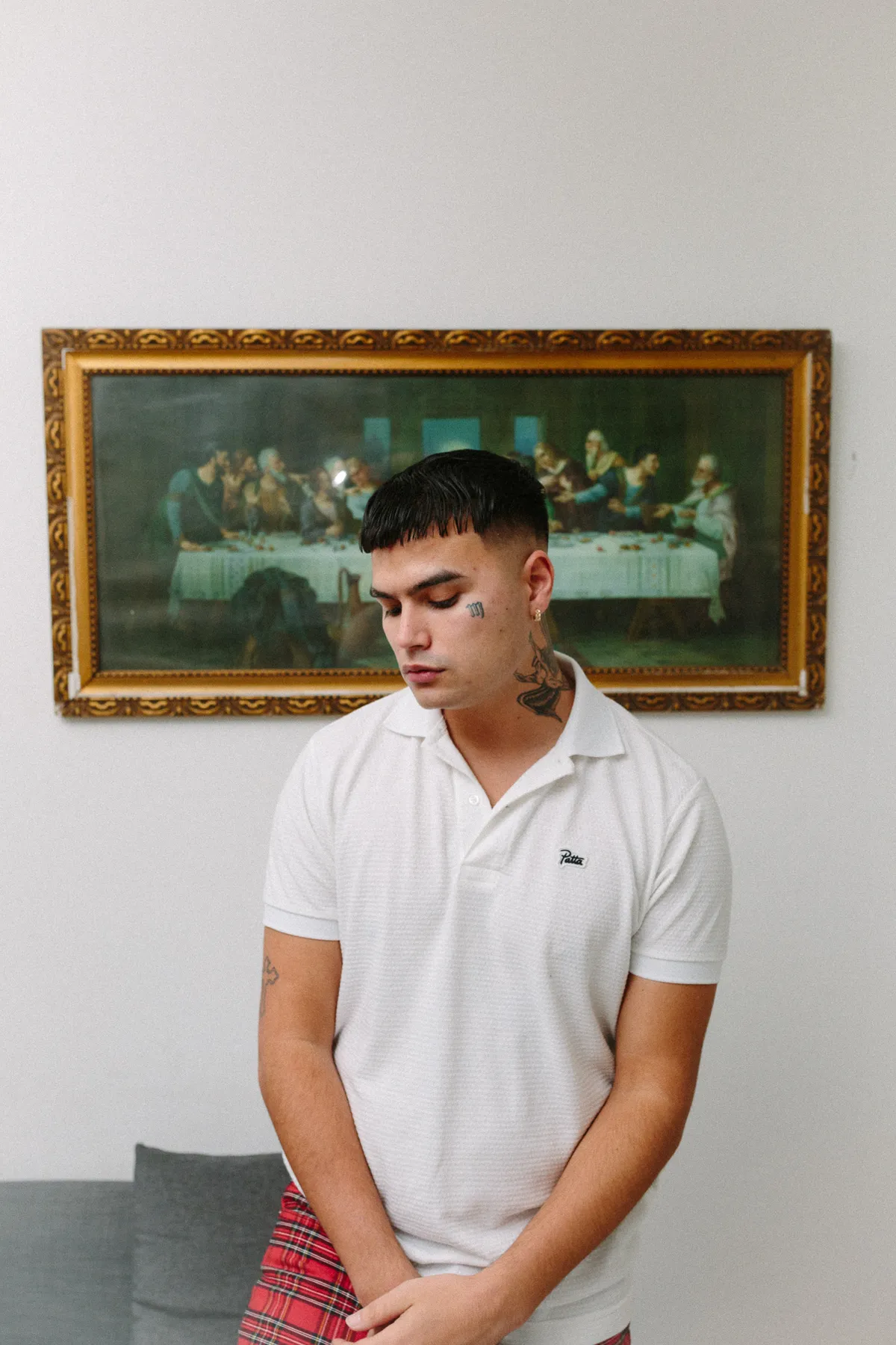 Voor de tv ligt een Japans zwaard met zijn naam erop, twee Les Paul-gitaren staan in de hoek te verstoffen naast Louis Vuitton-dozen. Zijn slaapkamer ziet eruit als een ontplofte kledingkast: overal op de grond sokken, onderbroeken en rommel. Zijn huisgenoot, Dylan Johnson van ANBU, ligt een deur verderop nog te pitten.