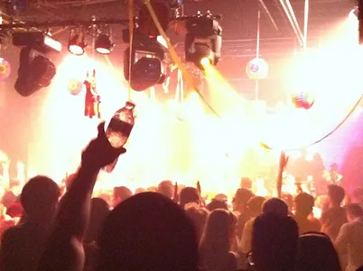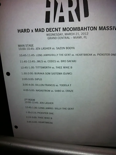 Het feest heette Hard-Miami-1: Moombah Massive en werd samen met Diplo’s platenlabel Mad Decent gegeven. Ik zag er wat bekenden. Onder andere Bronques van Last Nights Party, misschien wel de beroemdste party fotograaf van het moment. Ik kreeg een dikke keel bij het zien van een muurschildering ter ere van DJ Mehdi en besloot een Jagermeister op hem te drinken. Vrijdag is er een DJ Mehdi tribute ergens. Dat wordt tranen met tuiten huilen ben ik bang. Om twaalf uur was de tent al vrij vol. Zeker duizend man stond er totaal los te gaan op moombahton, een stijl die in Nederland helaas nauwelijks van de grond komt. Moombahton is dance op een laag tempo, die bol staat van de geiligheid, waar alle soorten (tropische) muziek door elkaar gegooid worden. Van samba tot gabber, van hiphop tot Afrikaanse kuduru en ga zo maar door. Op Valtifest waren we vorig jaar het eerste festival dat moombahton programmeerde, en dat gaan we dit jaar weer doen. Want het is super goed en kan heel groot worden, dat zag ik gisteren wel. Toen we na anderhalf uur weggingen was het er bomvol en ging het dak er faliekant driedubbel en dwars vanaf met een super leuk publiek.