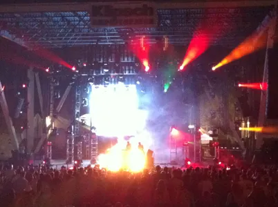 Ik heb een stukje van Justice gezien, dat was overweldigend goed, maar veel te druk daar. Op de plek waar ik stond duwde de kids tegen elkaar aan en liepen ze zelfs over anderen die op de grond in slaap waren gevallen of out waren gegaan. Ik trok dat niet en ben het vanaf backstage gaan bewonderen. Daar zie je helaas nagenoeg niets. Om mijn heen een kudde Lolo Ferrari look-a-likes, platina blond, lippen als luchtbedden, borsten waar menige melkkoe U tegen zou zeggen. Ze vonden me interessant, knipoogden naar me als hun vriendjes niet keken, herkenden in mijn buik waarschijnlijk het woord GELD. Het was er doodeng.