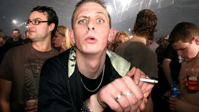 Tegen het hek vooraan in de Past-zaal bij Dj Chosen Few staat Martin. Hij is 24, maar al een veteraan. Door zijn rechter wenkbrauw heeft hij een piercing. Zijn hoofd is kaal, op een scherp gesneden baardje na. Tegen hem aan geleund staat zijn vriendinnetje van achttien, meer dood dan levend. Het is haar eerste grote feest, vertelt Martin. Voor hem zelf is Thunderdome meer dan een feestje. Het is ook een herdenking voor zijn dochtertje, dat drie jaar en drie dagen geleden overleed. Martin laat de sporen op zijn armen zien uit de periode die volgde. “Ik heb een uitkering van 600 euro”, zegt hij. “500 daarvan gaat op aan de huur. Een kamertje van vier bij vier. Ik heb mijn huisbaas deze maand niet betaald, omdat ik een kaartje moest kopen.” Gelukkig wil Martin zichzelf niet noemen, maar hij voelt een band met iedereen op het feest vanavond. “De sfeer is vanavond net als vroeger”, zegt hij. “Iedereen is tof tegen elkaar. Let op. Die jongen achter je ken ik niet. Ik ga nu een peuk bij hem bietsen.” Zijn eigen peuk geeft hij aan zijn meisje. Tien seconden later keert hij triomfantelijk terug met een sigaret. “En hij was niet eens Nederlands!”