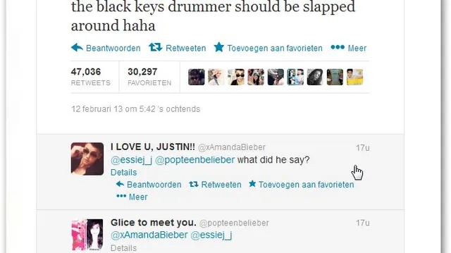 “The black keys drummer should be slapped around haha.” Met die eenvoudige Twitterboodschap aan zijn 34 miljoen volgers ontketende superster Justin Bieber gisteren een waar bombardement op Patrick Carney (95.000 volgers), die tijdens de Grammy-uitreiking een snoevende opmerking maakte over het Canadese tieneridool. “You are some one hit wonder. JB has been doing it for YEARS”, aldus een van de Beliebers. Een andere: “Hey old scary grandpa, FYI you are a bad drummer and YOU don't deserve TO BE in the BAND, OKAY?” Het was het zoveelste voorbeeld van Bieber-power op Twitter. Het is de hoeksteen van het succes van een modern tieneridool.