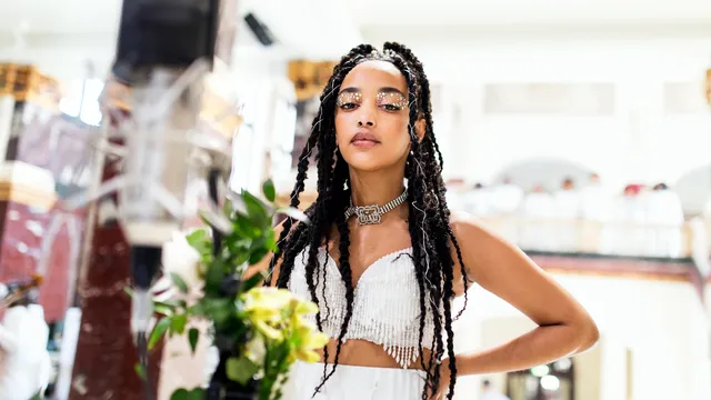 Wat deze sessie zo mooi maakt? Allereerst die locatie: de majestueuze marmeren hal van het Tropenmuseum in Amsterdam in haar volle glorie. Dan de muzikanten om haar heen: een strijkkwartet zet een sierlijke handtekening, een gospelkoor geeft nog meer power en haar toch al coole bas-synthman heeft een nog coolere outfit dan anders aan. Ook Rimon ziet er spectaculair uit in het werk van de Chinese designer Sensen Lii. ‘Hij staat bekend om experimentele en expressionistische kleding’, vertelt de zangeres. ‘Toen ik hem DM'de reageerde hij heel enthousiast, we zijn letterlijk 48 uur voor de shoot naar Antwerpen gereden om daar items uit te kiezen.’