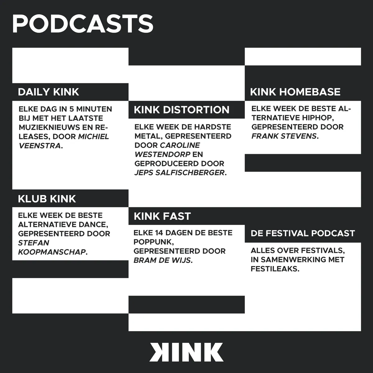 Naast de lineaire programmering maakt KINK vandaag ook een podcast line-up bekend. Die zal nog wat gespecialiseerder zijn. Michiel Veenstra zal zelf een korte dagelijkse podcast rond het muzieknieuws doen, en daarnaast zijn er podcasts over metal, hiphop, dance en poppunk. De lineaire versie van KINK zal online te beluisteren zijn en ook via DAB+, de digitale opvolger van FM, gratis te ontvangen zijn met een daarvoor geschikt radiotoestel.