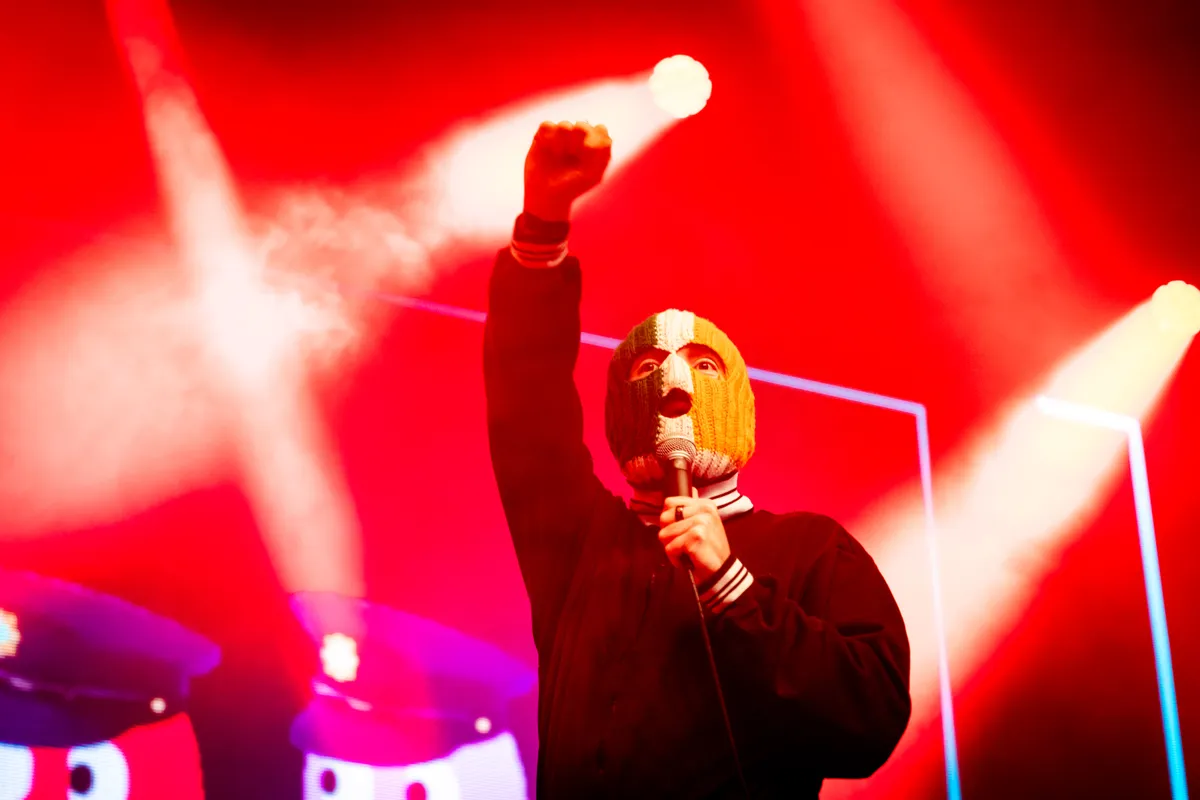 Dan serieus: ‘Nee, ik denk dat alles rondom Coachella en Fox News, en onze rechtszaak met de Britse overheid, vooral laat zien dat er nog genoeg is om muziek over te maken. Als er iets is wat Kneecap niet tekort komt, is het subject matter.’