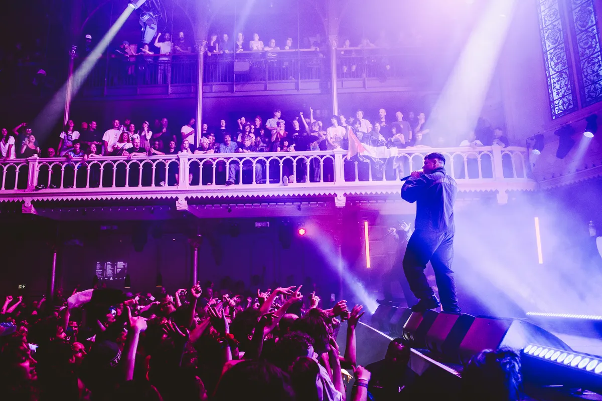 Het glas in lood boven het podium kleurt groen, wit en oranje. De AFAS wacht. En die ene sleutelzin uit de Kneecap-film echoot na: ‘There ain’t better publicity than getting banned from something.’