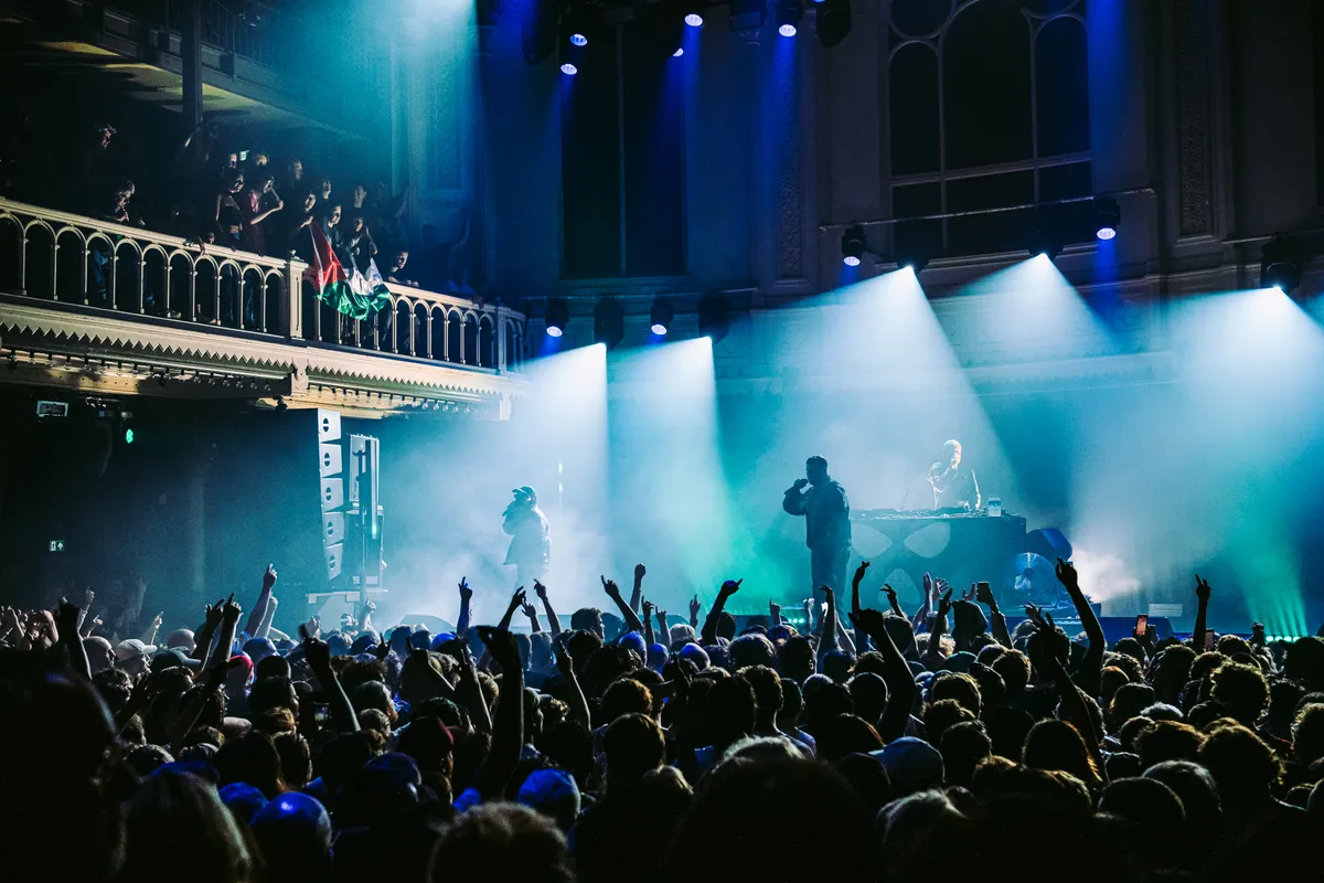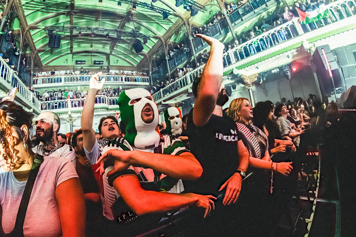 Wat er ook gebeurd mag zijn, de gevolgen zijn er zeker. Hun Amerikaanse tour werd gecanceld, Orbán liet hen niet eens binnen in Hongarije, en ook in Amsterdam gingen petities rond om Kneecap uit Paradiso te weren. De popzaal reageerde met een poster aan de overkant van de straat, met een citaat van Massive Attack. ‘Artists are not the story, Gaza is the story’ lees je op de plakzuil, terwijl de extra beveiligers je grondig fouilleren en een scanner langs je zakken halen.