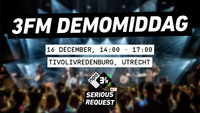 Ben je producer en heb je op je zolderkamer een nummer in elkaar geknutseld? Ben je een rapper en wil je weten wat er voor nodig is om op de radio te komen? Ben je benieuwd wat de beste volgende stap is voor je band? De Serious Request Demomiddag is de beste plek om erachter te komen. Een leger aan muziekprofessionals (waaronder de grootsten van TOPNOTCH, Friendly Fire, Dapper/UNIVERSAL en natuurlijk 3voor12) neemt op zaterdag 16 december in TivoliVredenburg (Utrecht) de tijd om naar je muziek te luisteren en je advies te geven om meer te halen uit je muziekcarriére. Neem hiervoor je muziek mee op een telefoon/laptop. Een echte must voor de beginnende muzikant dus en natuurlijk niet geheel onbelangrijk: je steunt een prachtig doel.