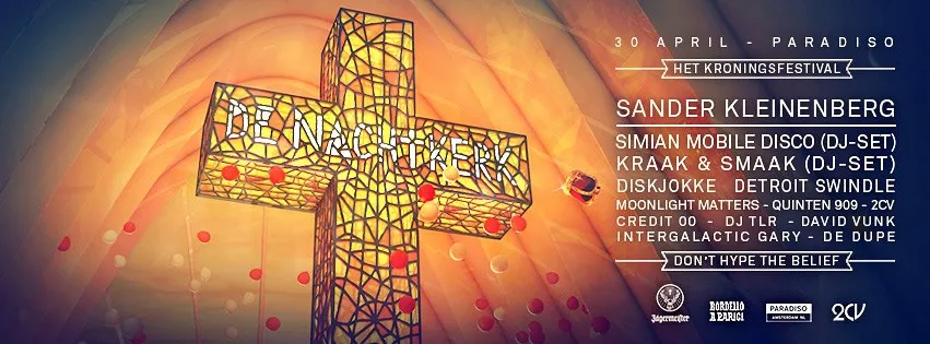 De Nachtkerk draagt als ondertitel "don't hype the belief" en staat in ieder geval voor een Kroningsfeest in alle zalen van Paradiso met hoge gasten: Sander Kleinenberg, Simian Mobile Disco (Dj-Set) en Kraak & Smaak (Dj-Set) staan in de grote zaal. Verder o.a. Diskjokke (No), Detroit Swindle en Moonlight Matters (Be), Dj TLR en Intergalactic Gary.