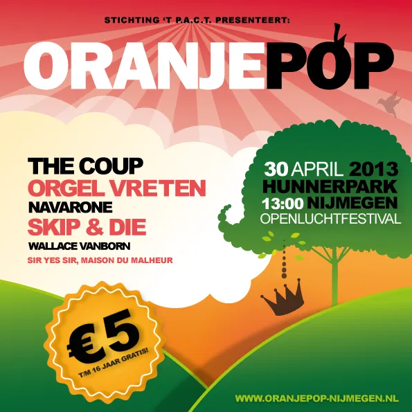 Mooie traditie in Nijmegen is het Oranjepop openluchtfestival in het Hunnerpark. Dit jaar heffen ze voor het eerst entree (vorig jaar pay-what-you-want), maar €5,- is heel schappelijk voor de vele nationale en internationale acts als The Coup, Skip&Die, Lavalu, Maison Du Malheur, Navarone, Wallace Vanborn en Sir Yes Sir. 3voor12 Gelderland vult het tweede podium met o.a. Suit and Tie Johns, Villa Zeno, OIIO en The Heat en ze weten ook waarom je sowieso naar Oranjepop moet.